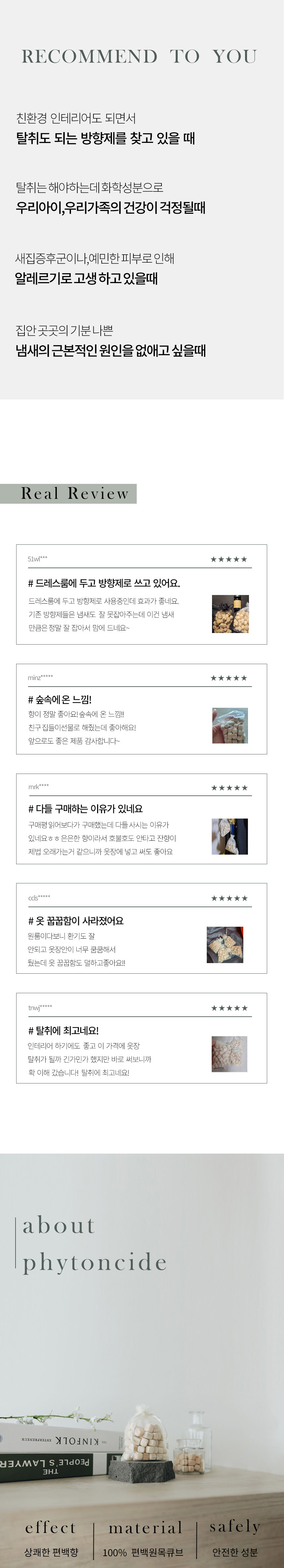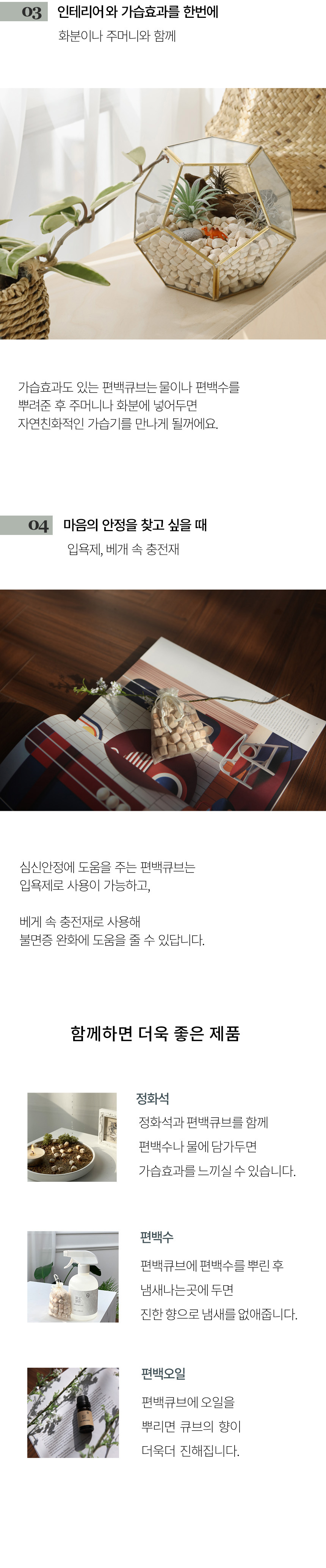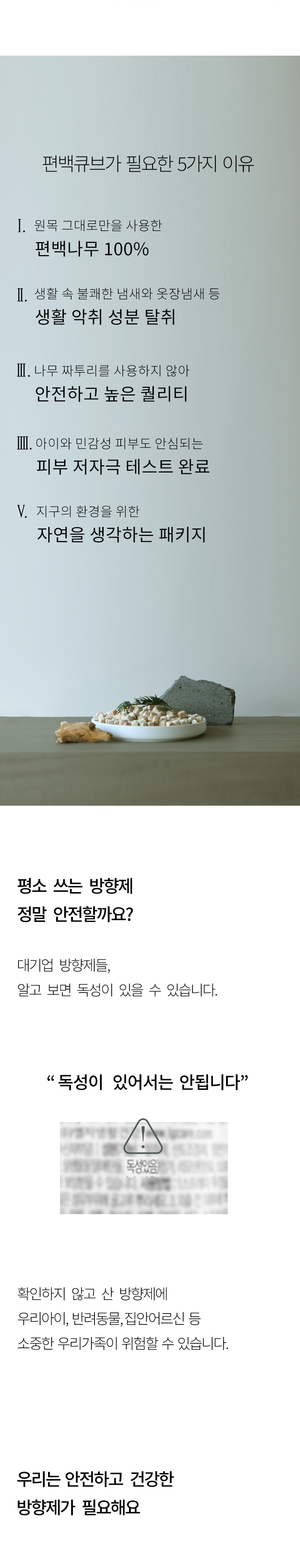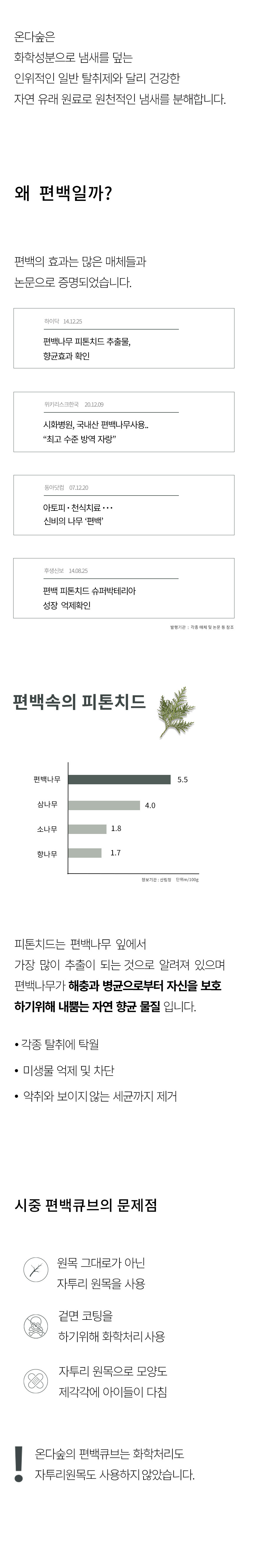- 편백나무의 가장 좋은 부분만을 원목 그대로 사용하여 향이 풍부함- 모서리가 둥근 고른 모양으로 안전하며 인테리어에도 적합- 각종 탈취에 탁월- 미생물 억제 및 차단- 악취와 보이지 않는 세균까지 제거- 화학처리, 코팅 FREE- 세계 아토피 협회 인증 제품- 피부 저자극 테스트 완료