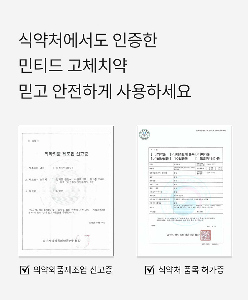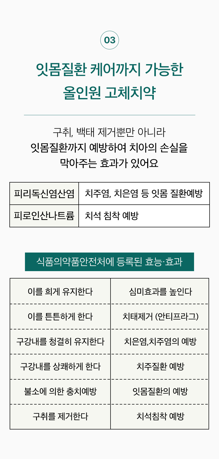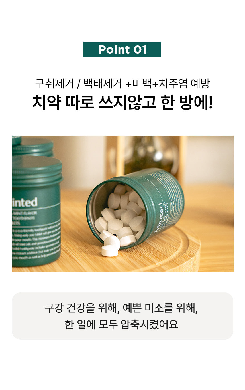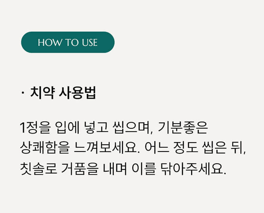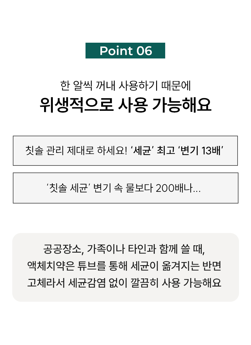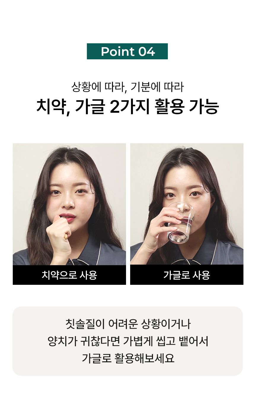 -일반 치약 대비 물과 열을 가하지 않고 고체형태로 타정하여 찍어내는 방식으로 제조되어, 유효성분이 유실이없고 이에 따라 일반 치약 대비 더 우수한 효과를 보임