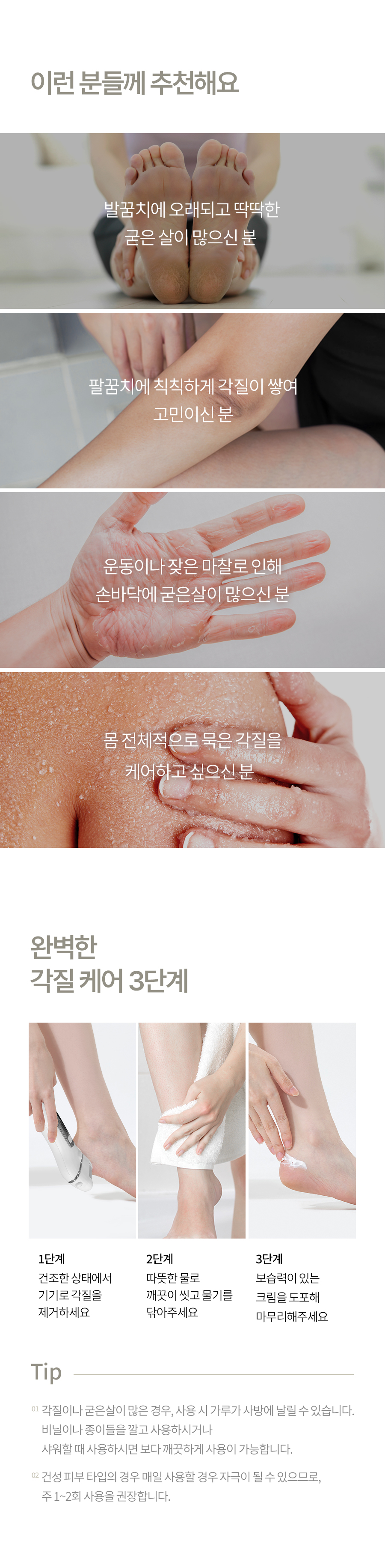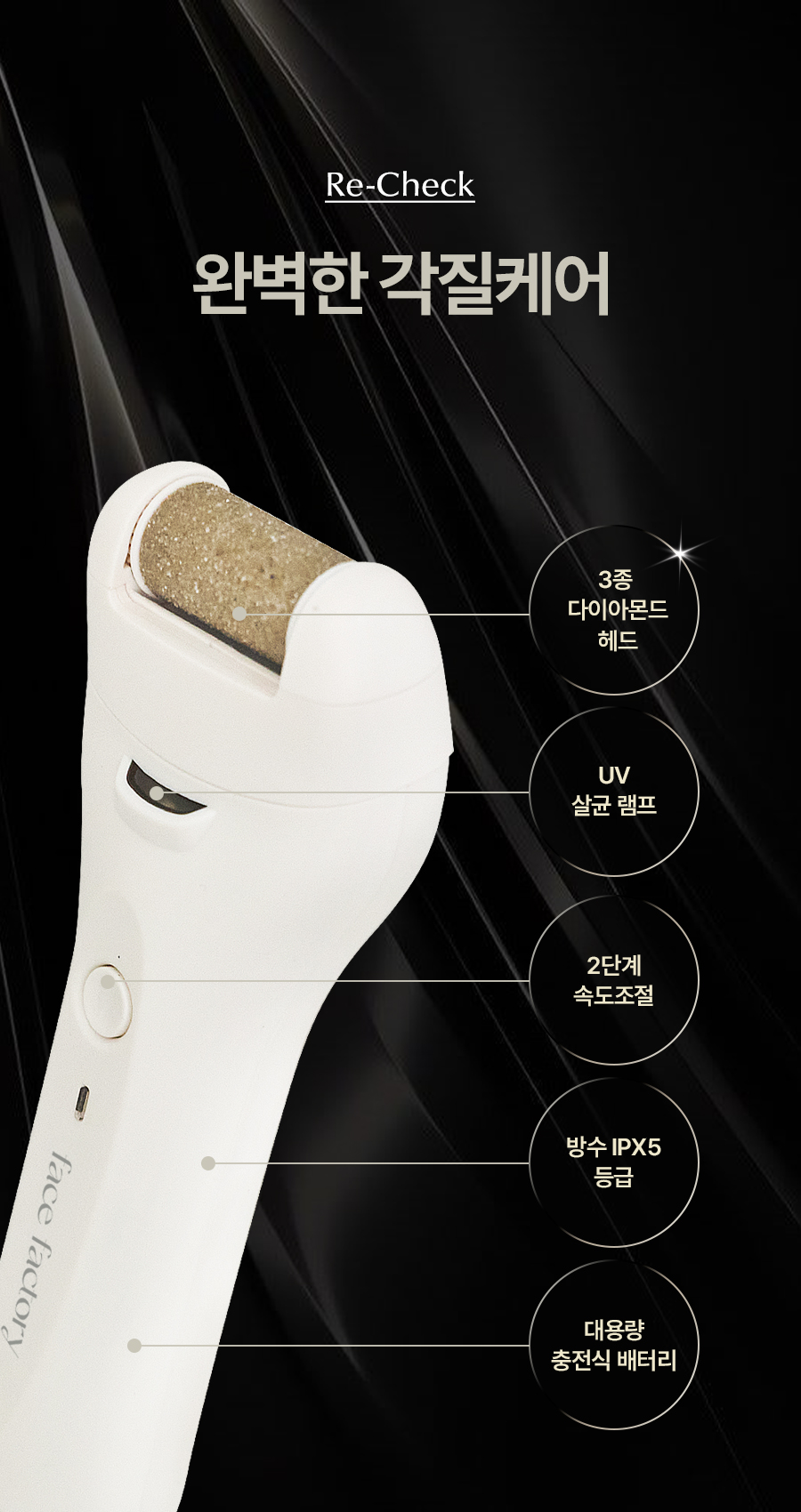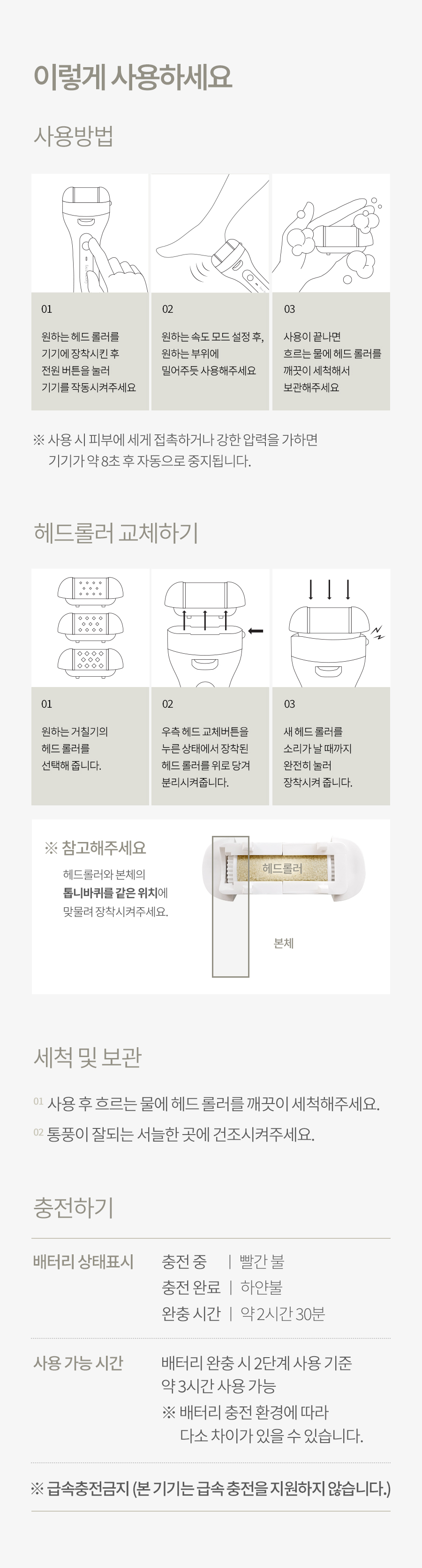 -집에서 손쉬운 각질관리 (UV살균램프 + 2단계 속도조절 + 3가지 헤드롤러)-간편한 세척 및 보관 (헤드 물세척, 내부브러쉬 이용)-무선으로 언제 어디서나 휴대가능-헤드부분 다이아몬드 가루로 미느라 힘빠지는 각질제거기 NO! 닿기만해도 각질 우수수-역대급 완판 행렬! 재고만 들어오면 품절템-자사몰만 약 8000개의 리뷰, 평점 4.8 고객 만족도 최상 !