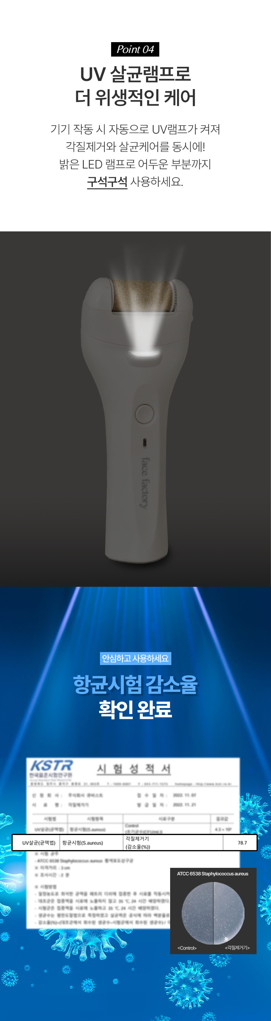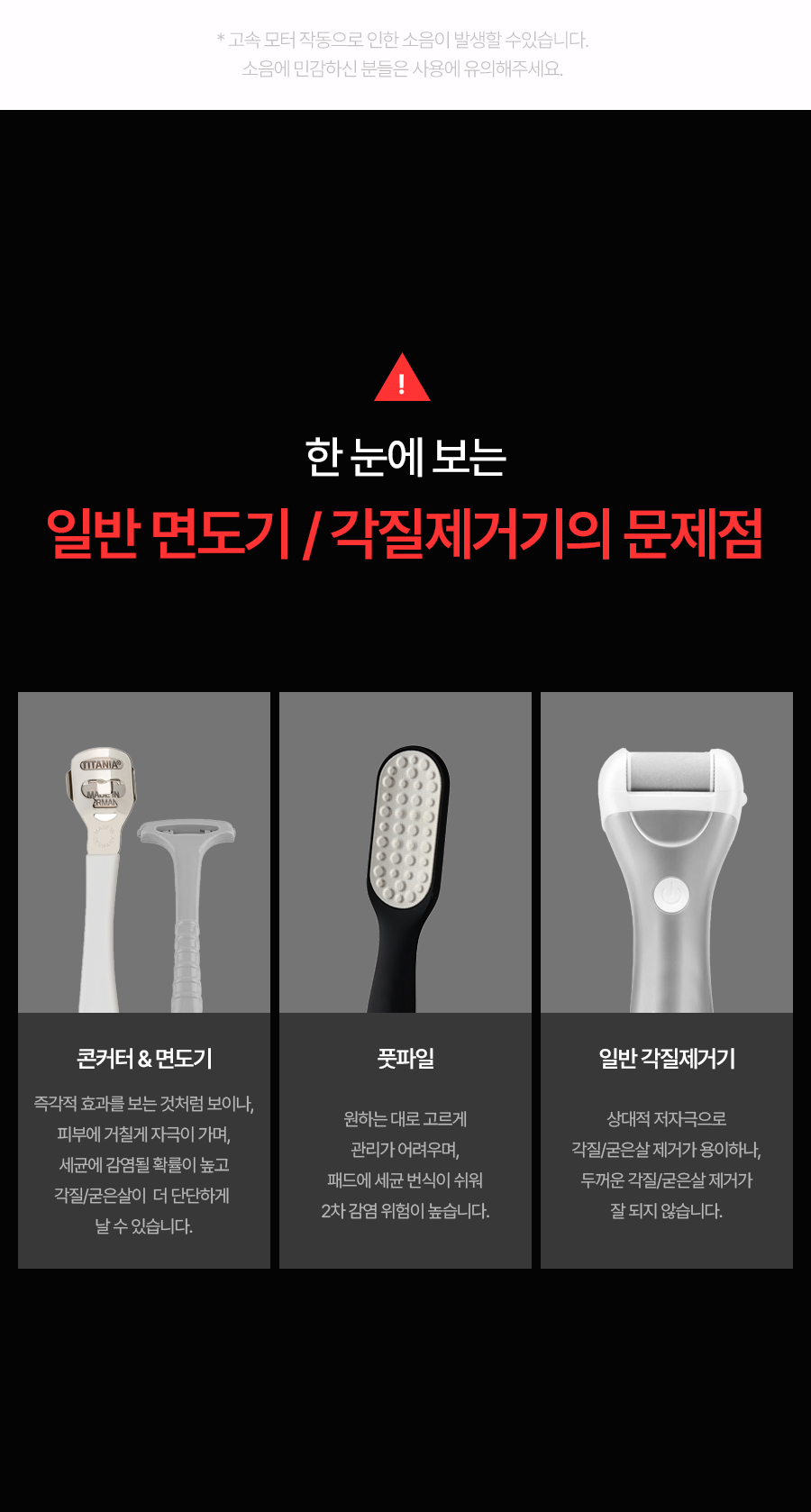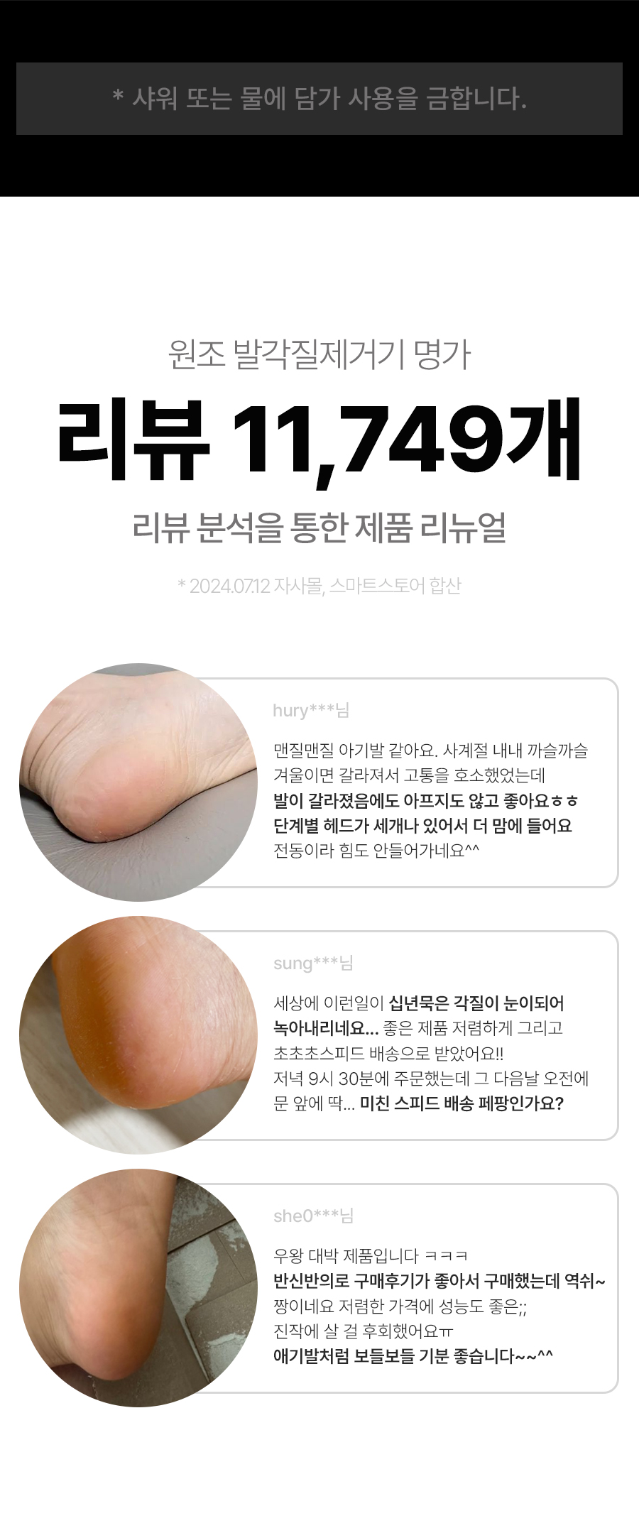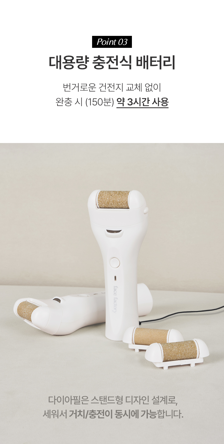-집에서 손쉬운 각질관리 (UV살균램프 + 2단계 속도조절 + 3가지 헤드롤러)-간편한 세척 및 보관 (헤드 물세척, 내부브러쉬 이용)-무선으로 언제 어디서나 휴대가능-헤드부분 다이아몬드 가루로 미느라 힘빠지는 각질제거기 NO! 닿기만해도 각질 우수수-역대급 완판 행렬! 재고만 들어오면 품절템-자사몰만 약 8000개의 리뷰, 평점 4.8 고객 만족도 최상 !