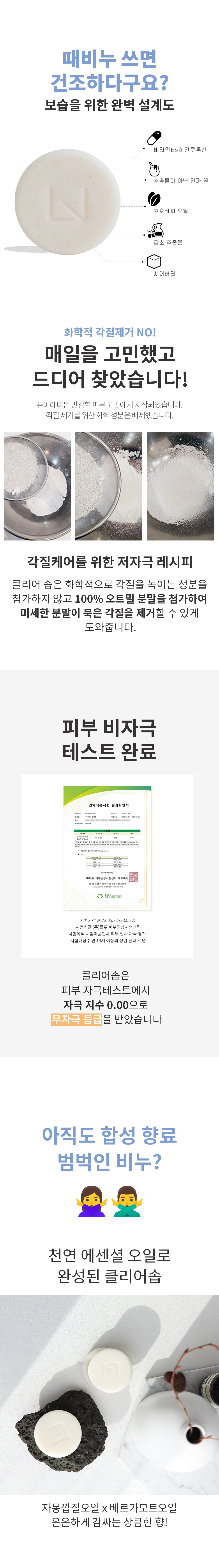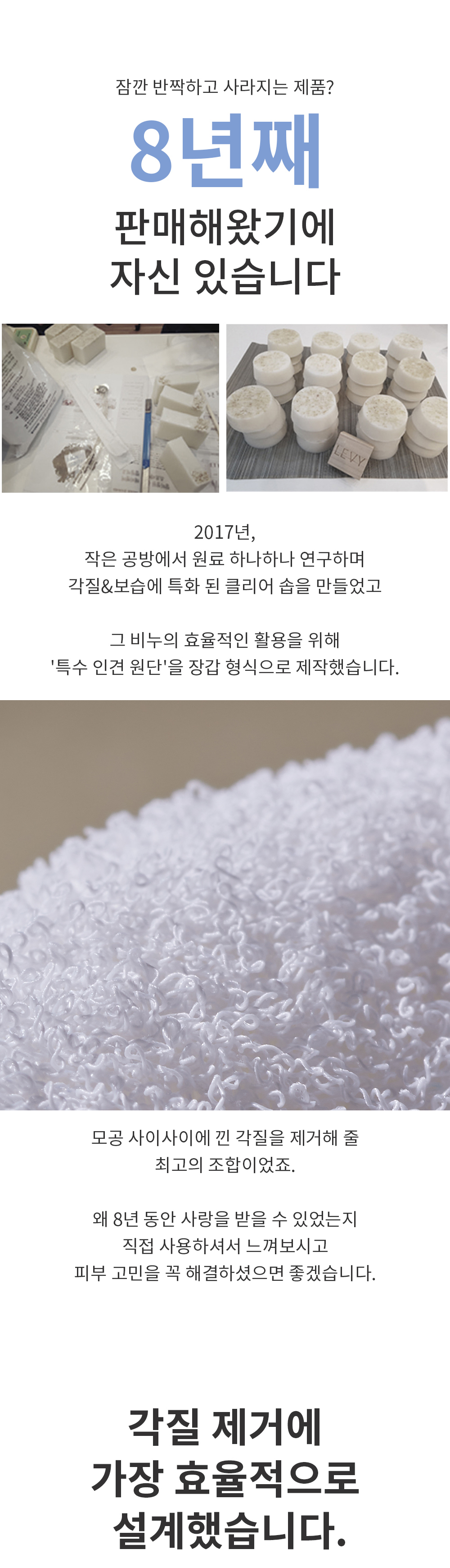 -8년간 33만개 판매되었으며 재구매율이 높음-시중에 때비누는 사용 후 많이 건조하지만 해당 제품은 보습 성분이 첨가되어 단점 보완함-화학 성분이 아닌 오트밀 분말로 각질 케어-피부 자극 수치 0.0 '비자극' 판정 받음
