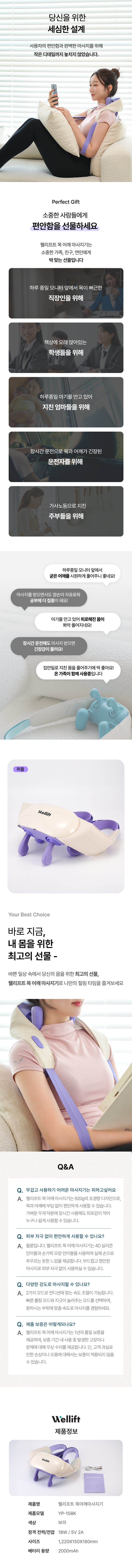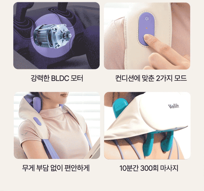 -엄지손가락 안마볼로 손마사지 구현-온열기능으로 제품 보다 빠르고 편안하게 피로한 근육뭉침 해소.-2종 어깨스트랩으로 마사지중에도 두손이 자유로움.-약 1kg의 경량으로 마사지 중에도 무게 부담 없는 제품-BLDC모터 사용. 강력, 저소음, 모터 내구성을 갖춘 마사지건