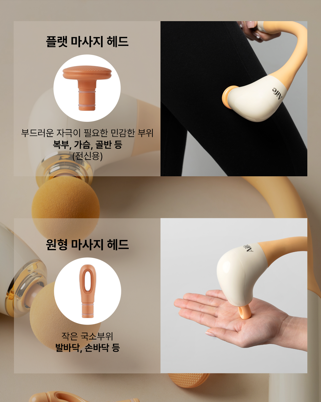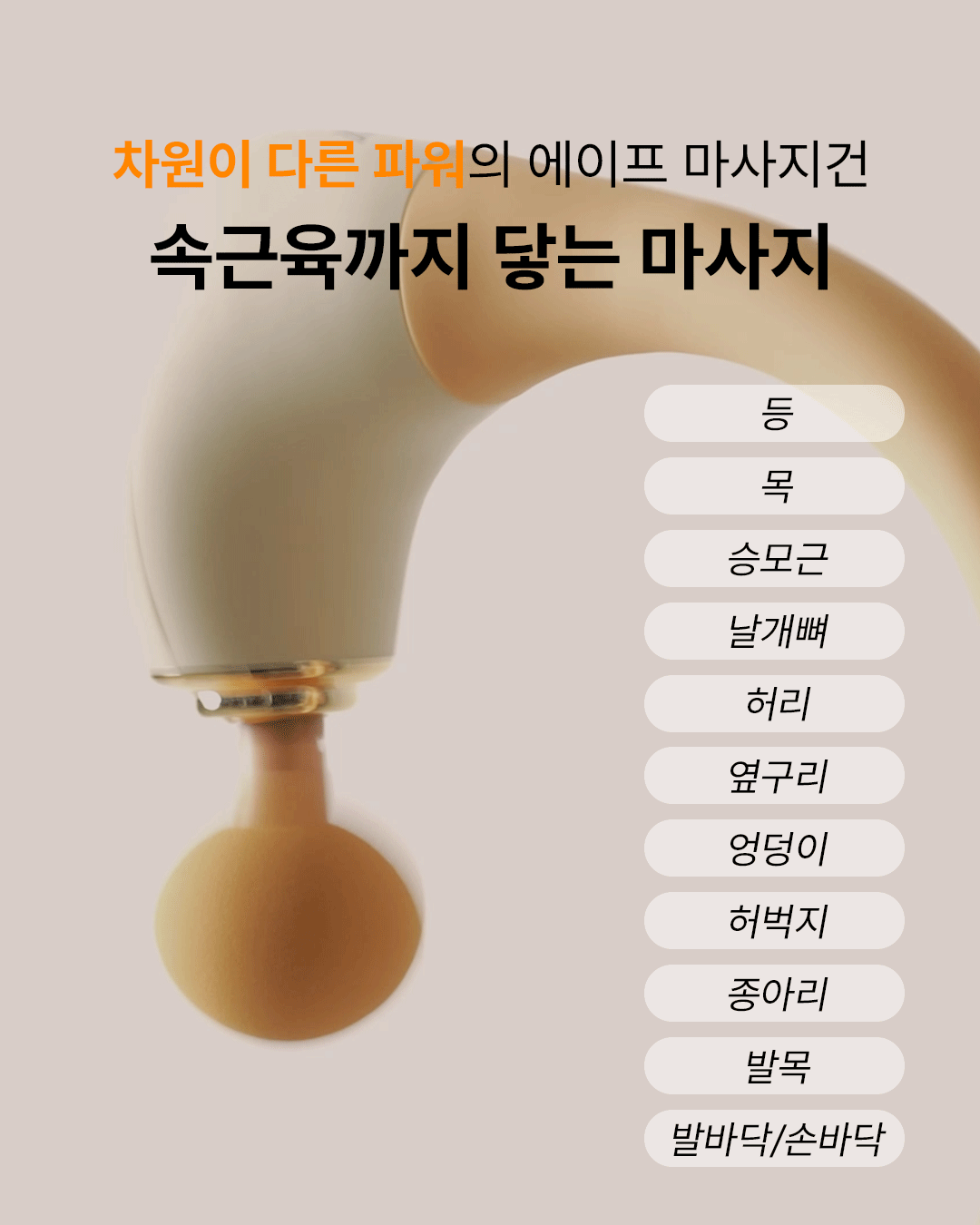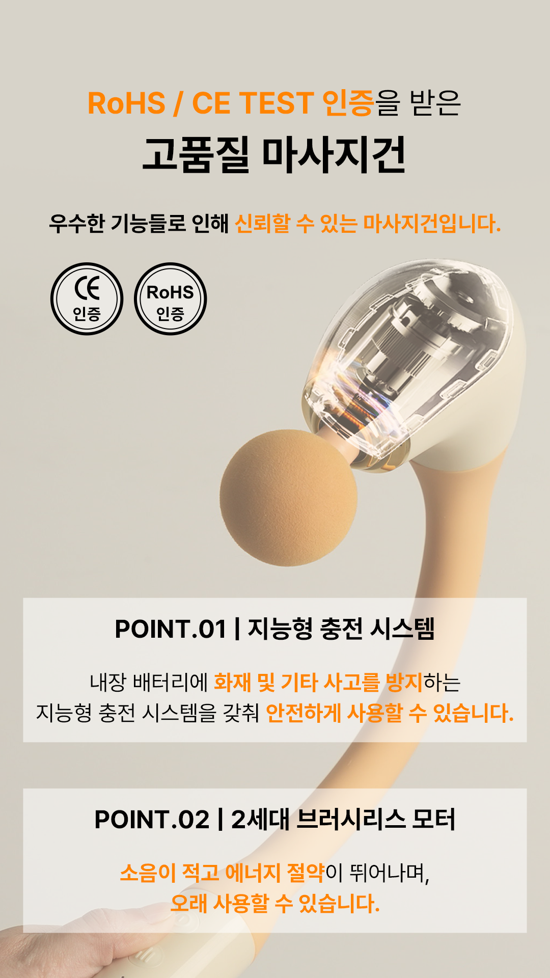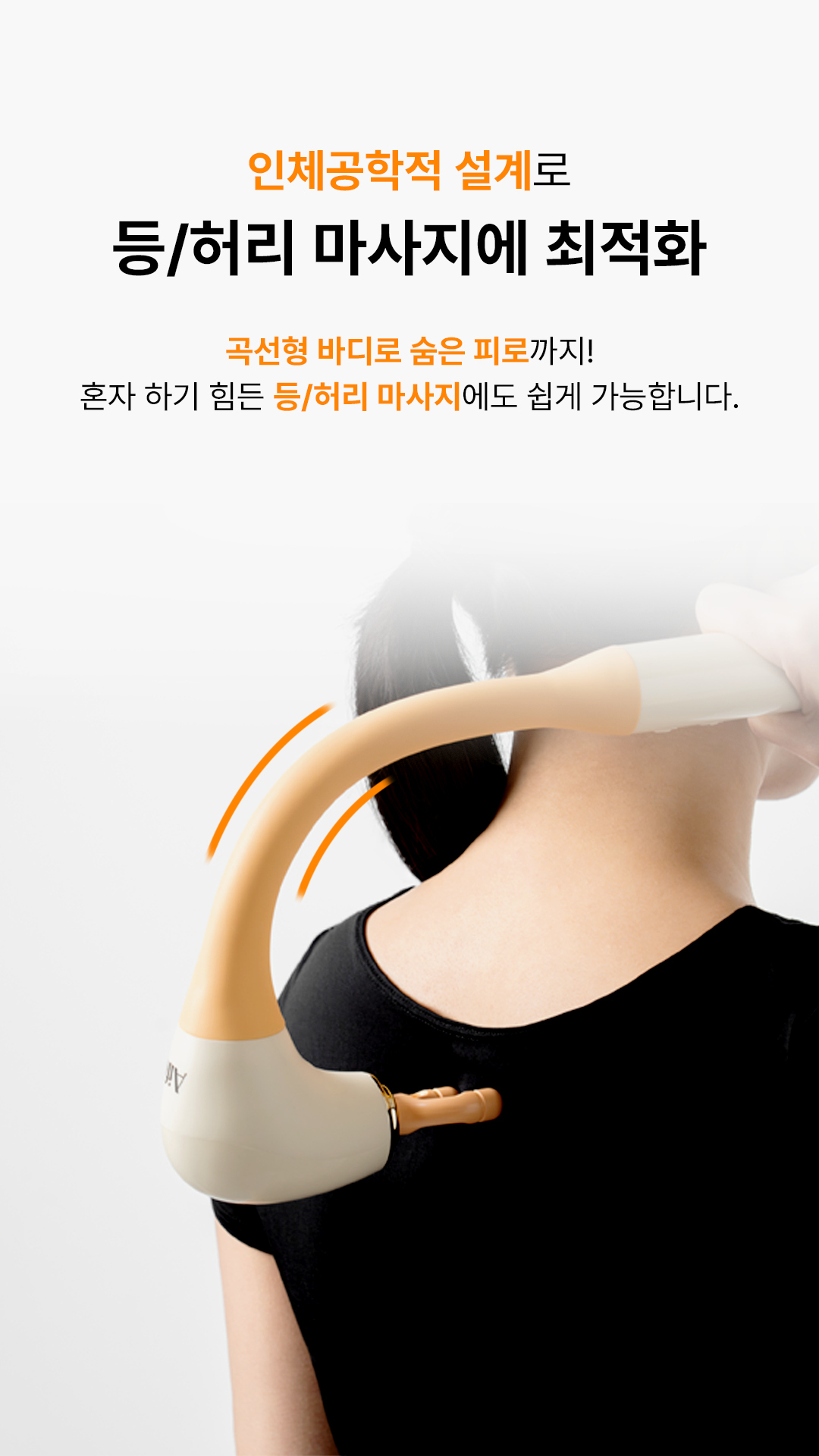곡선형 형태로 손에 안닿는곳까지 구석구석 마사지!-인체공학적 설계로 등/허리 마사지에 최적화-강력하지만 통증 없는 마사지 효과-내 몸에 맞춰 5단계 세기 조절-부위별로 사용할 수 있는 4가지 마사지 헤드-RoHS와 CE TEST 인증을 받은 고품질 마사지건-화재 및 기타 현상을 과도하게 유발하지 않는 지능형 충전 시스템-2세대 브러시리스 모터를 사용하여 조용하고, 에너지 절약으로 오래 사용 가능