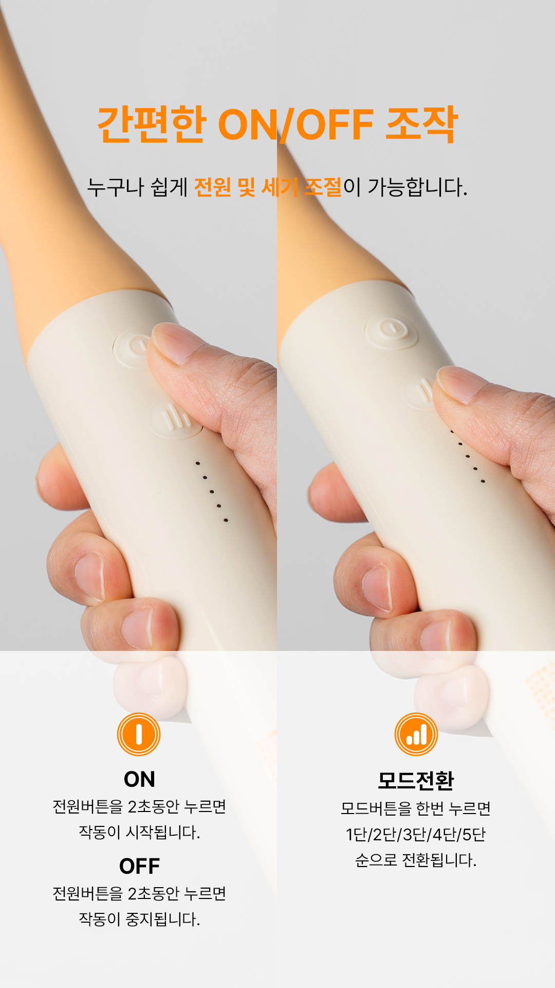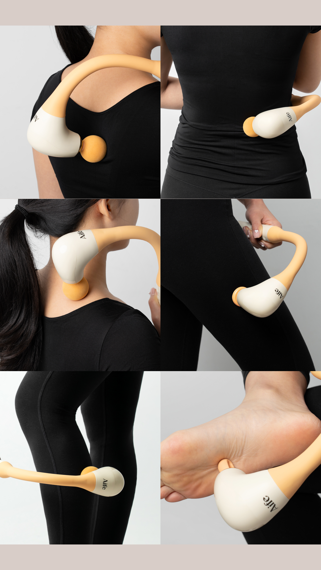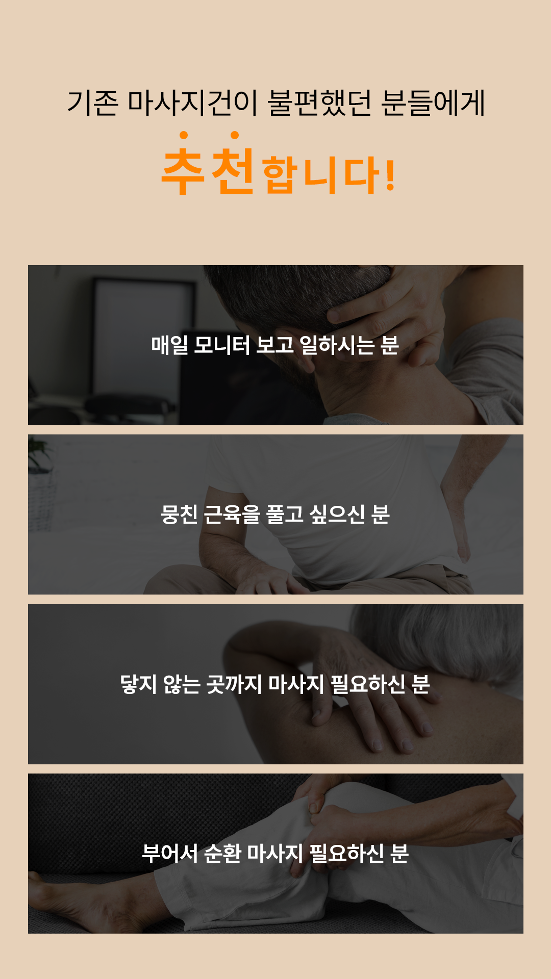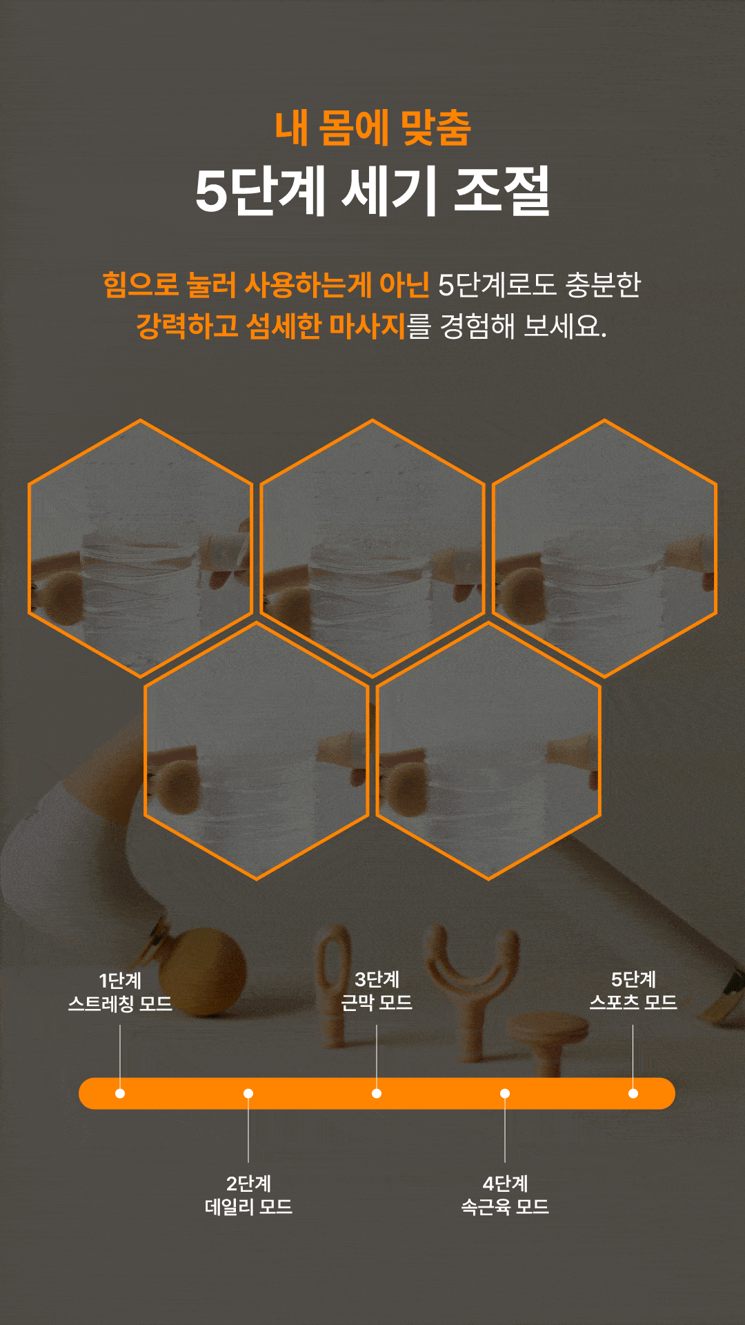 곡선형 형태로 손에 안닿는곳까지 구석구석 마사지!-인체공학적 설계로 등/허리 마사지에 최적화-강력하지만 통증 없는 마사지 효과-내 몸에 맞춰 5단계 세기 조절-부위별로 사용할 수 있는 4가지 마사지 헤드-RoHS와 CE TEST 인증을 받은 고품질 마사지건-화재 및 기타 현상을 과도하게 유발하지 않는 지능형 충전 시스템-2세대 브러시리스 모터를 사용하여 조용하고, 에너지 절약으로 오래 사용 가능