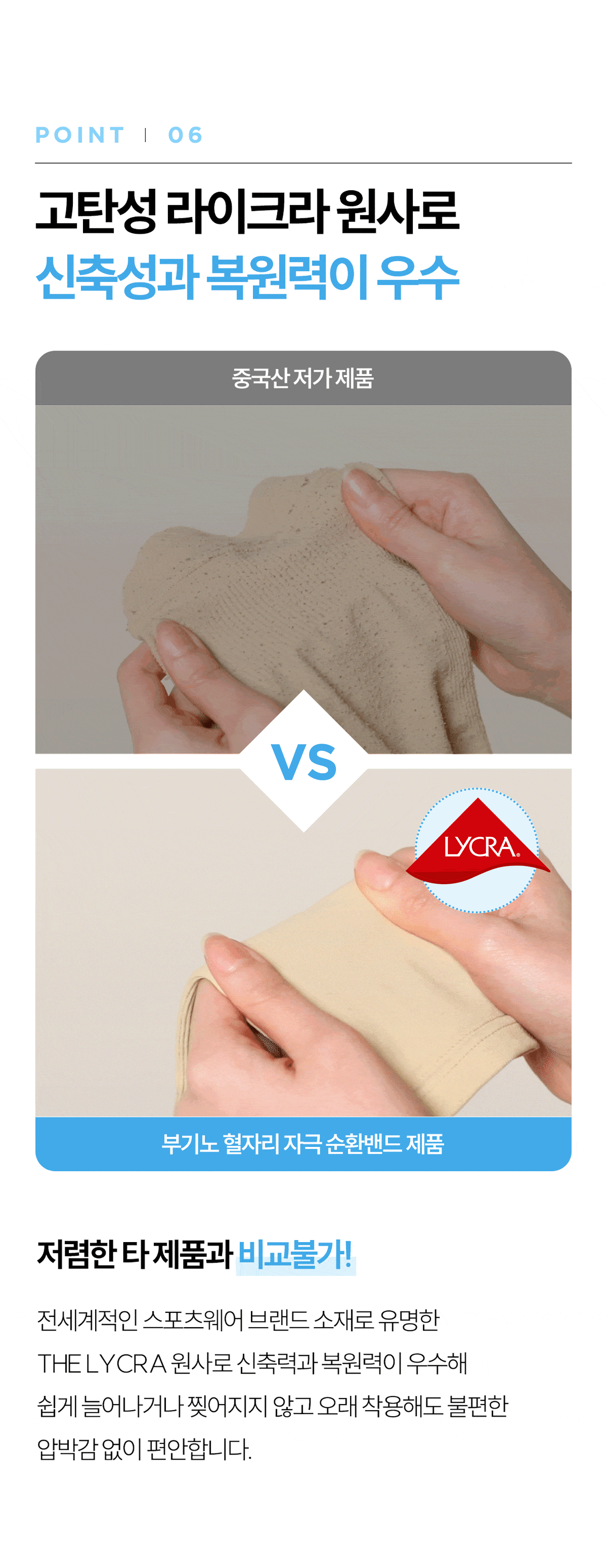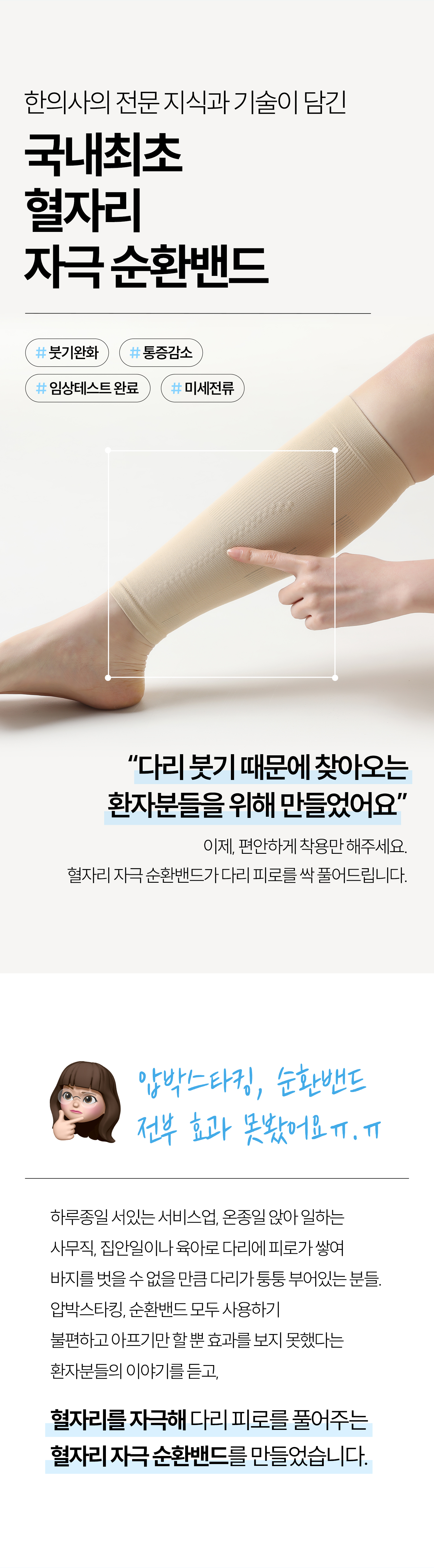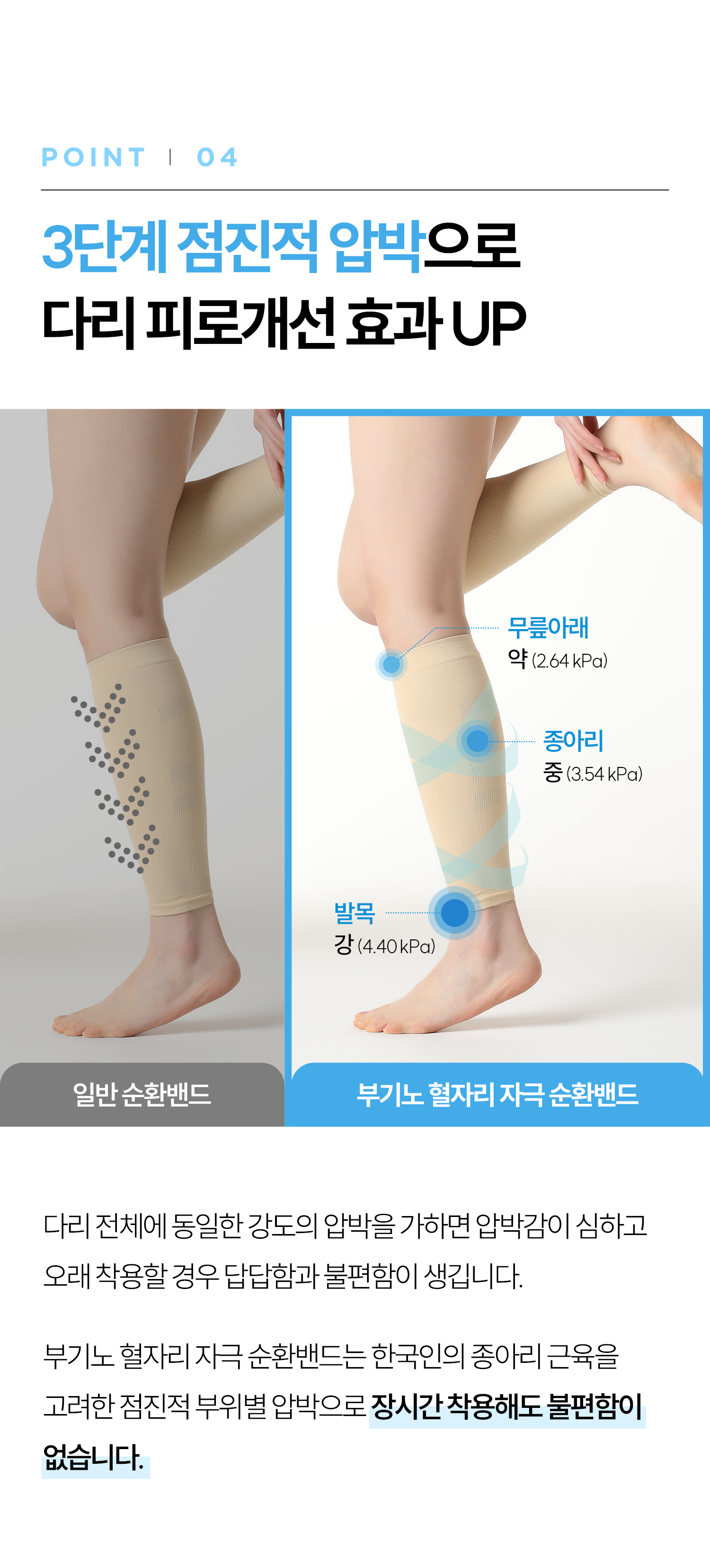 1. 한의사가 짚어주는 포인트를 자극하는 혈자리지압 기능2. 미세전류가 흐르는 특수원사로 혈액순환3. 종아리 부위별로 3단계 압박으로 효과 증대4. 신축성과 복원력이 우수한 라이크라원사