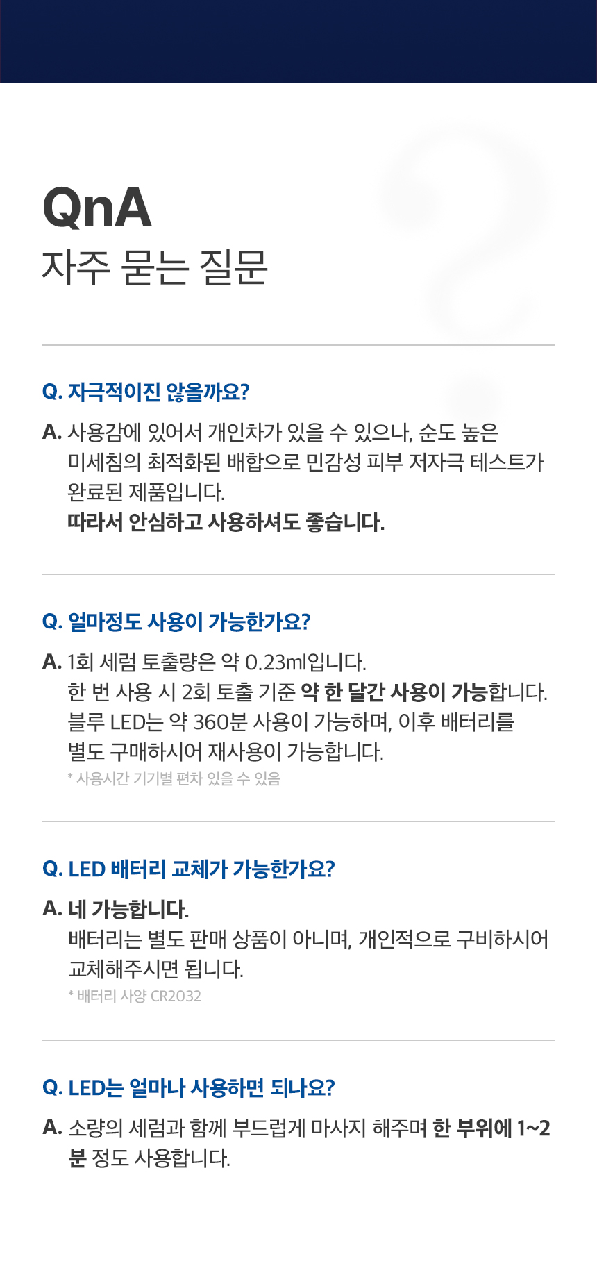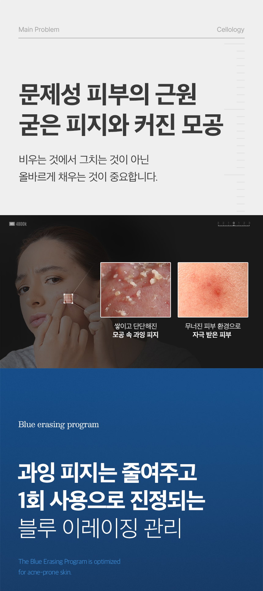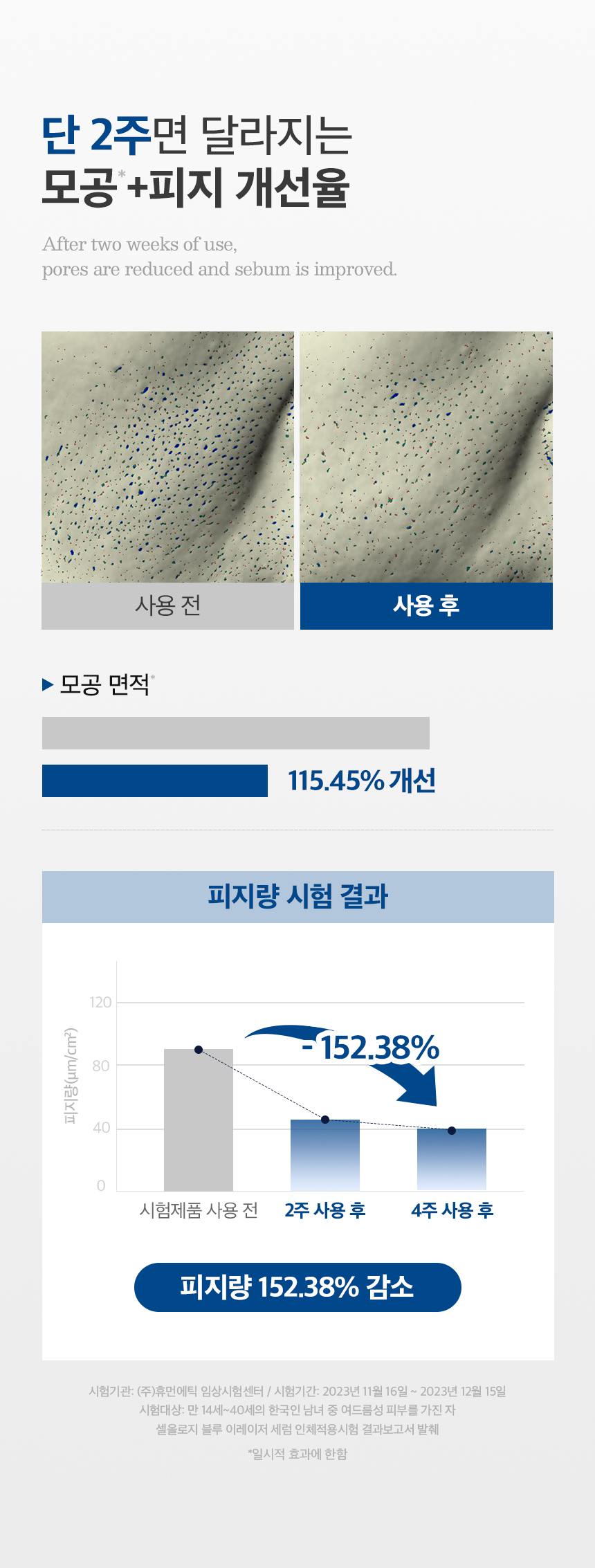 1. 뷰티 브랜드 파워 2년 연속 1위 (전 제품 공통)2. 모공, 피지 개선 2주 임상시험 완료3. 순도 99% 미세 스피큘 함유4. 피부 속 흡수를 돕는 블루LED 진동 디바이스