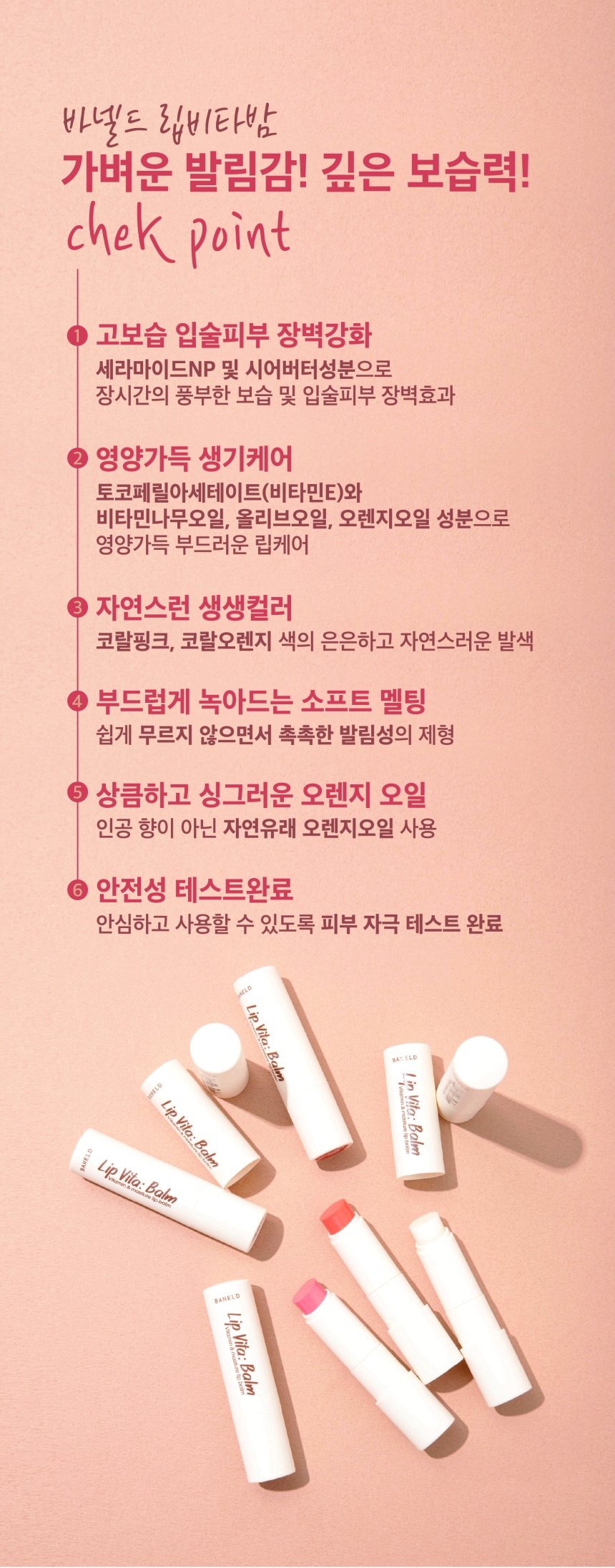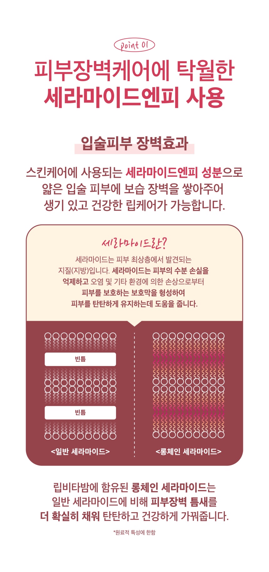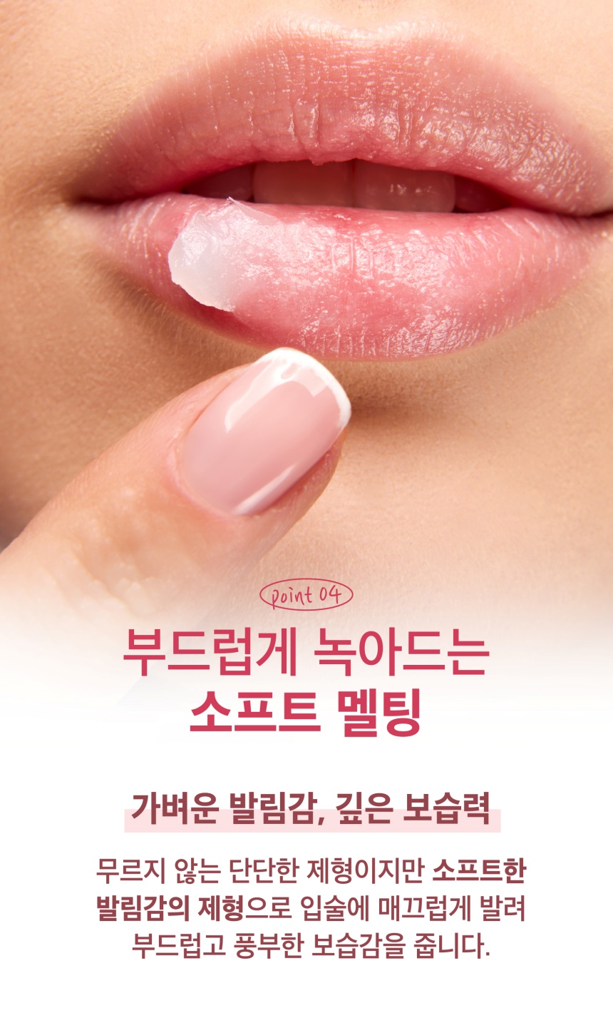 -세라마이드NP성분을 사용해 입술장벽강화 및 보호가능-시어버터와 3가지 식물성오일로 고보습&고영양-단단한 제형으로 무르지 않고, 가벼운 발림성-입술에 생기를 더하는 코랄핑크 색상