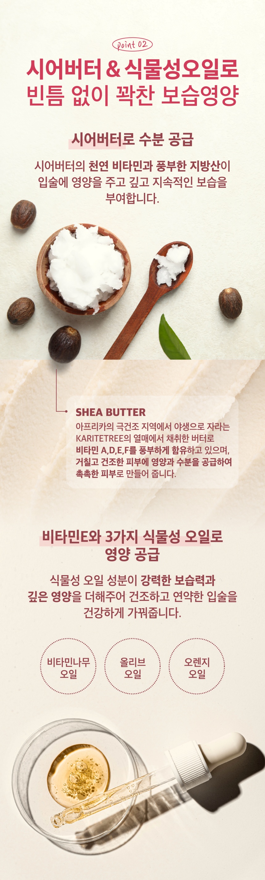 -세라마이드NP성분을 사용해 입술장벽강화 및 보호가능-시어버터와 3가지 식물성오일로 고보습&고영양-단단한 제형으로 무르지 않고, 가벼운 발림성-입술에 생기를 더하는 코랄오렌지 색상