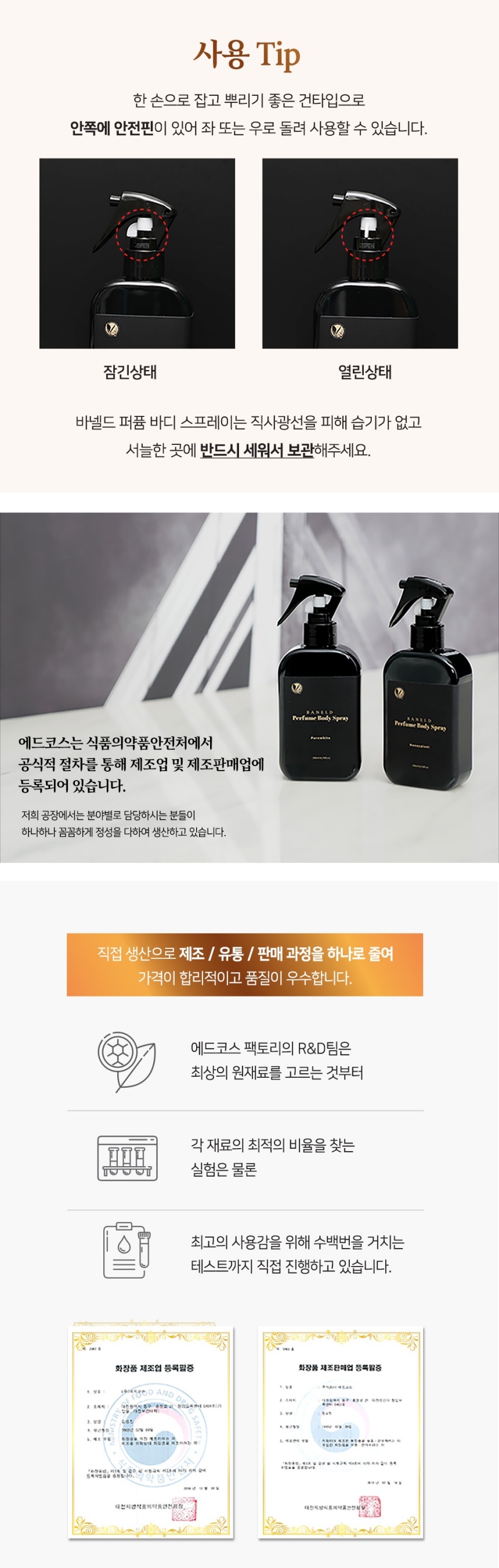 -전성분 EWG 그린등급으로 순하고 안전한 성분-비건인증 제품으로, 동물성 원료&성분을 사용하지 않고 동물실험을 하지 않음-건타입 스프레이 용기라 사용이 편하고, 넓고 고른 분사력