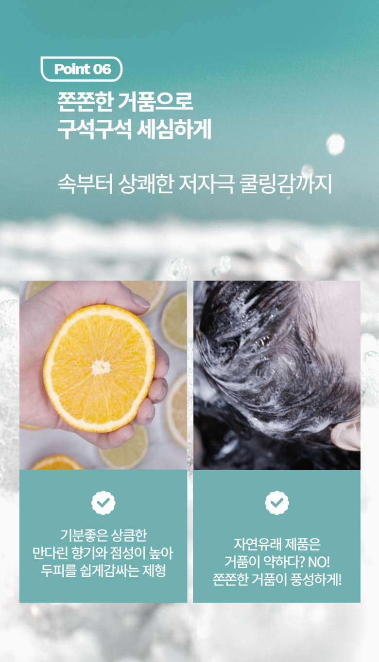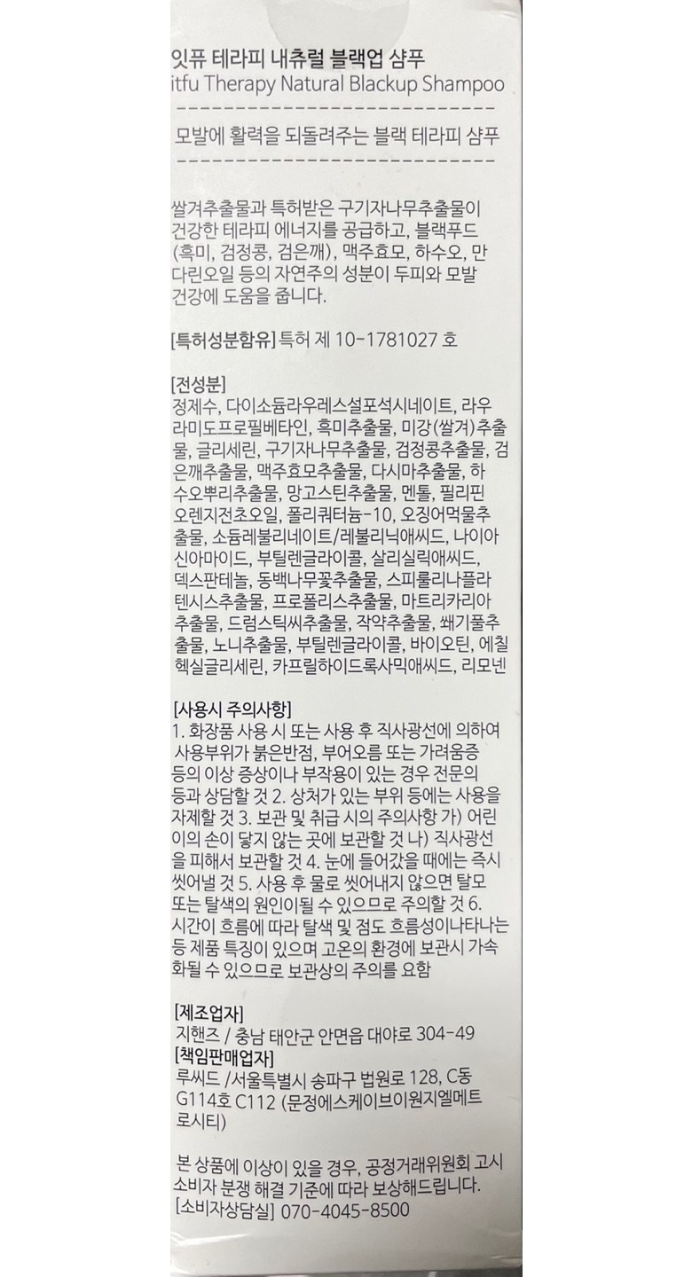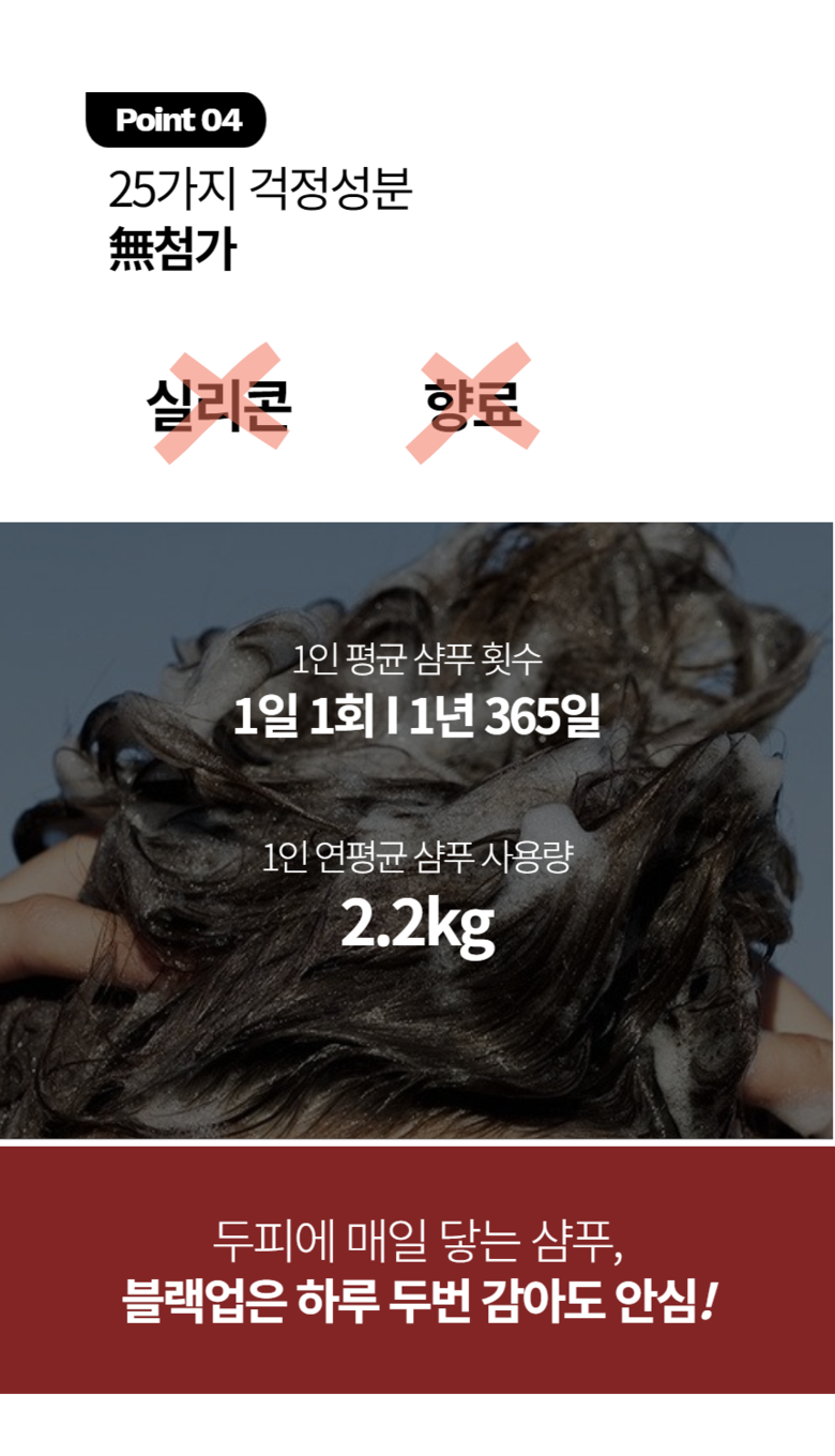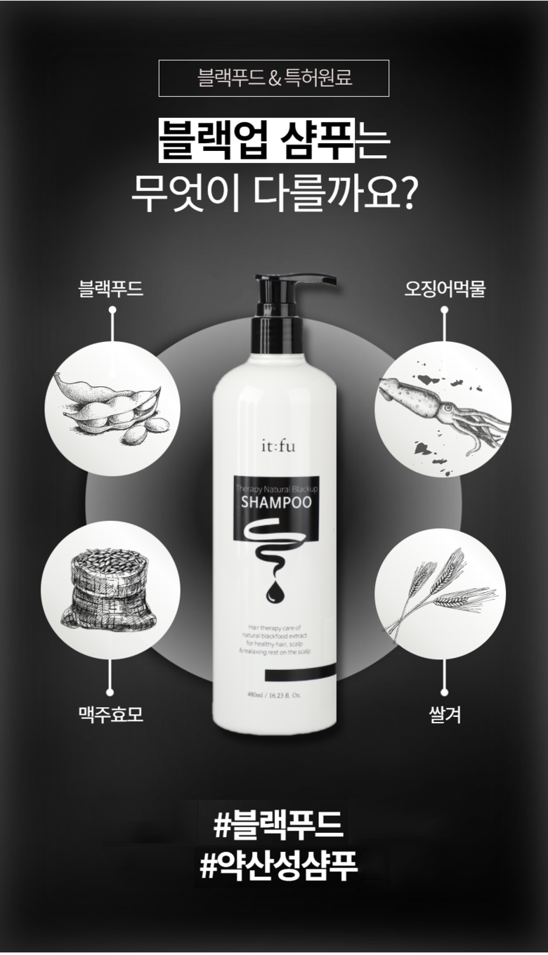 - 검은 모발 케어 샴푸- 주요성분: 블랙푸드, 오징어먹물추출물, 구기자(멜라닌 활성화 특허원료)- 타겟 및 효과: 흰머리/새치 고민 케어