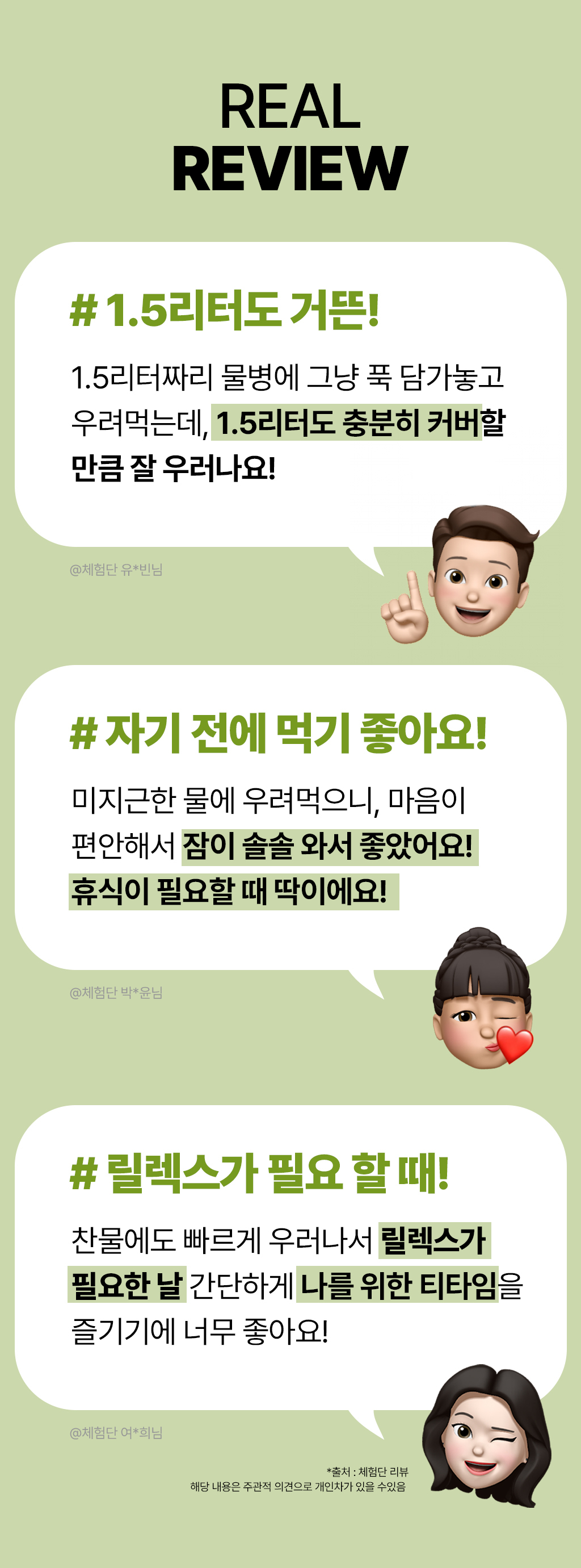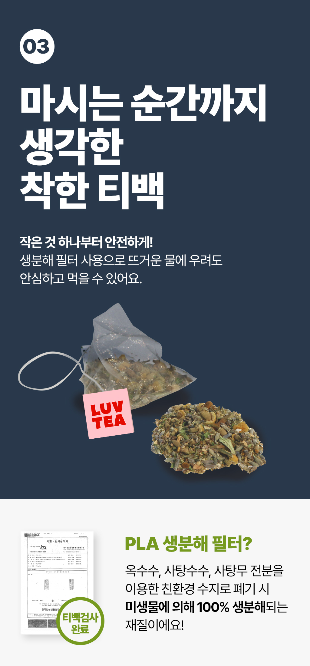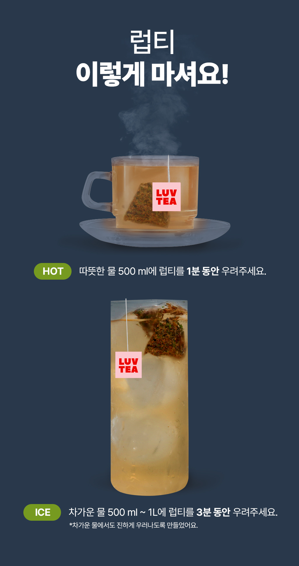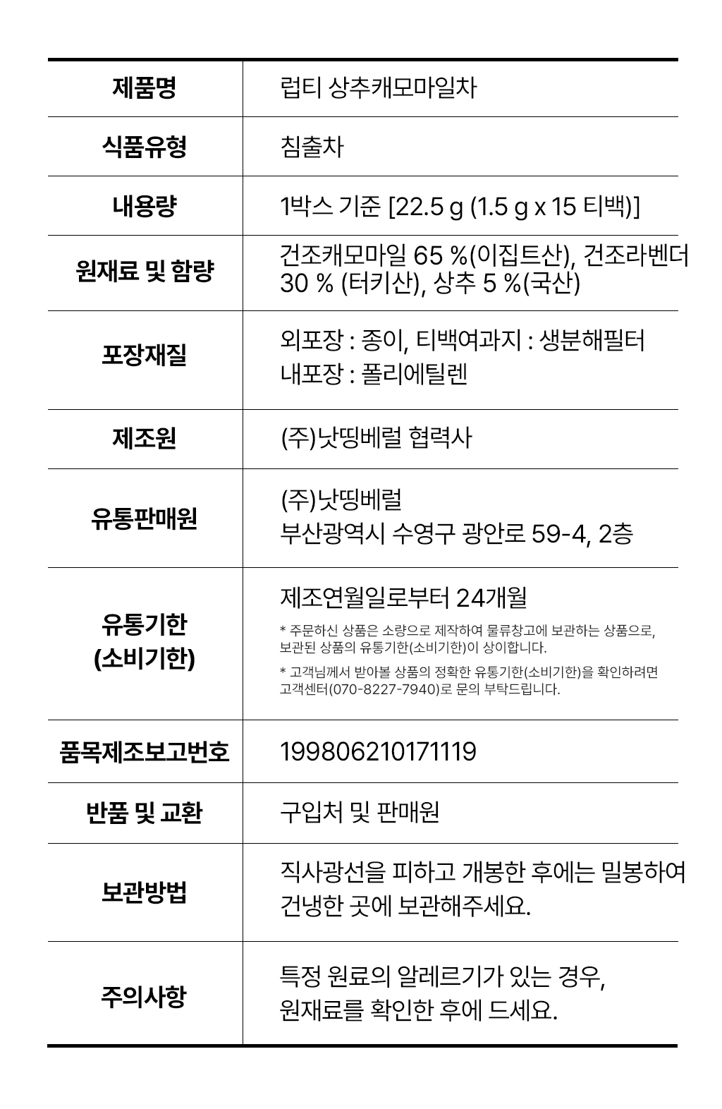 - 올리브영 입점 상품- 상추, 캐모마일 블렌딩- 진하게 우러나는 원료 고유의 맛과 향- 카페인 ZERO / 합성향료 ZERO / 인공첨가물 ZERO- 생분해 필터로 뜨거운 물에 우려도 안전