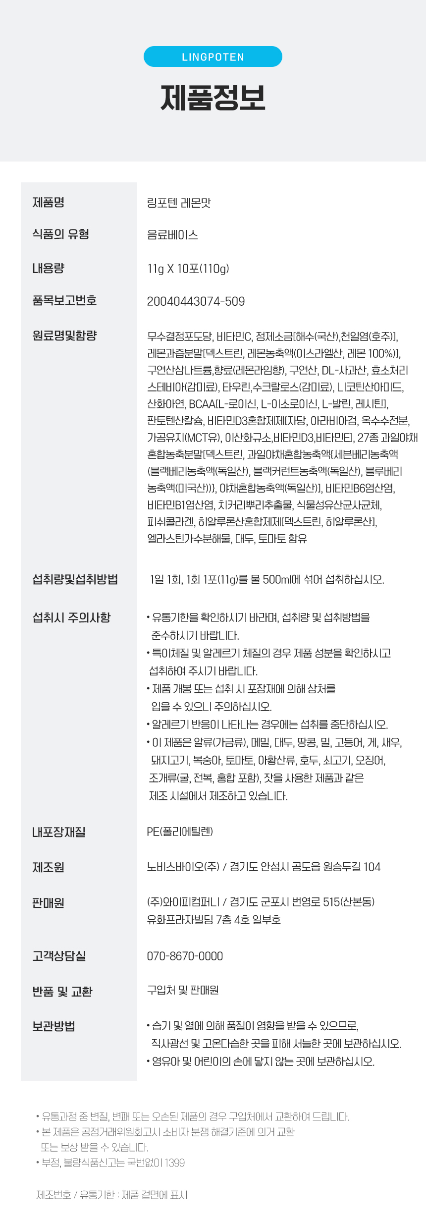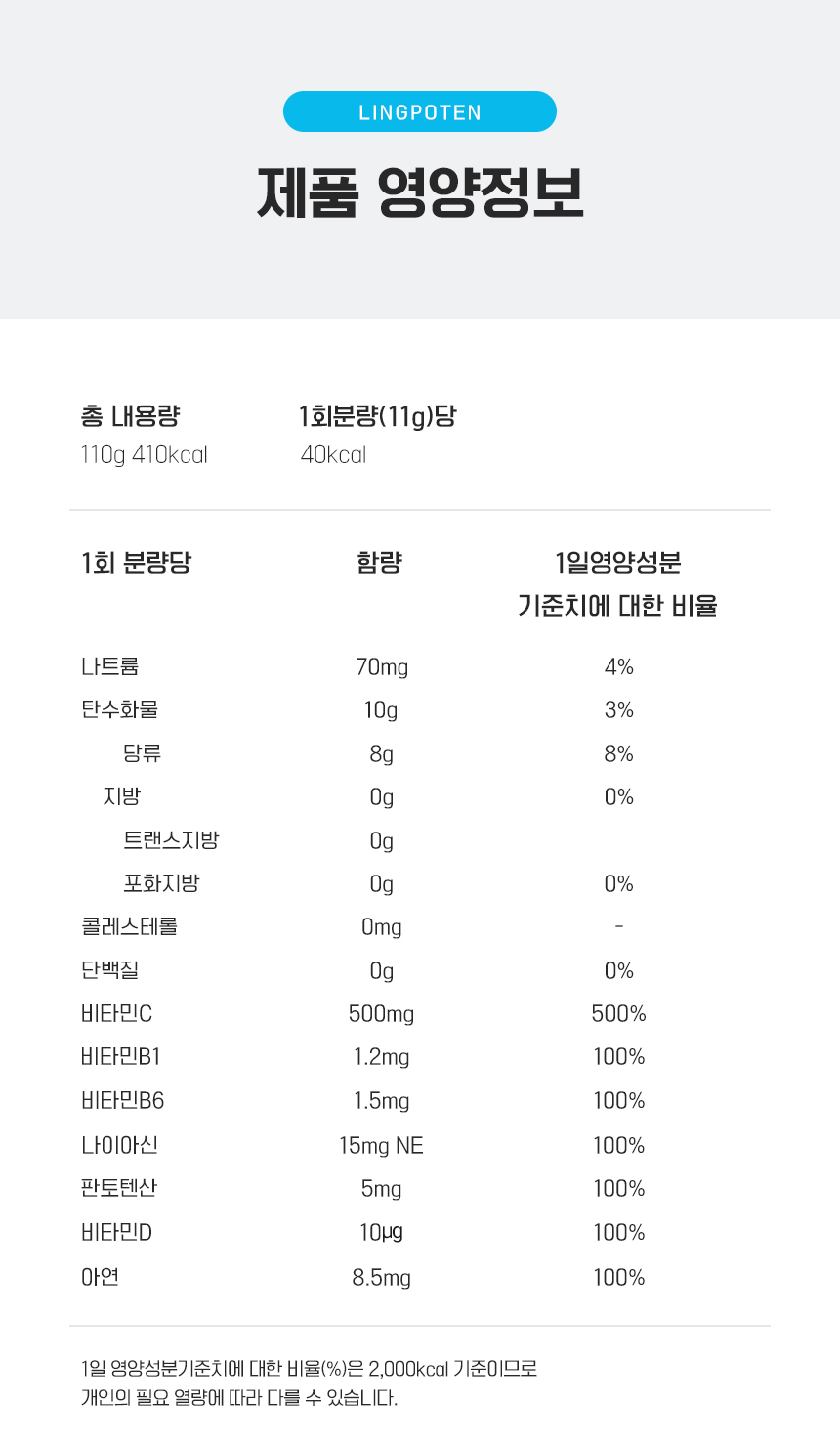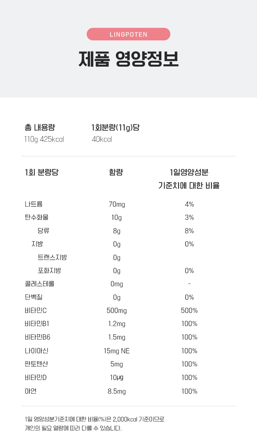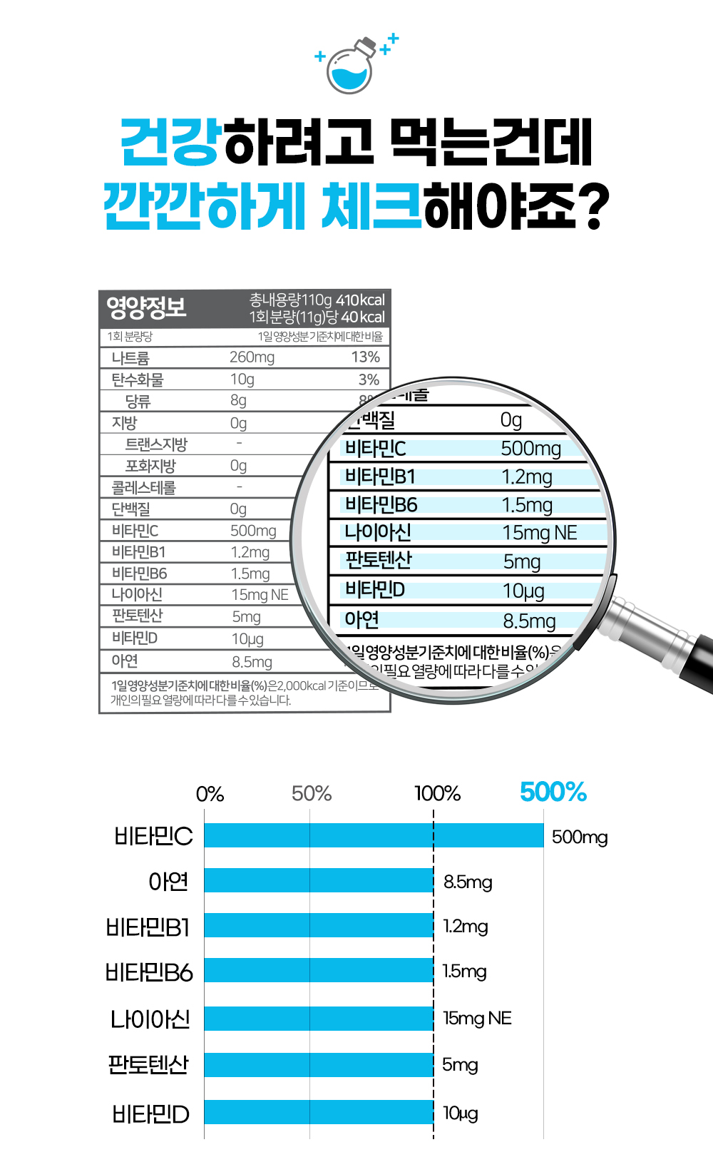 ◾아연100% / 비타민C 500% / 비타민B6 100% / 비타민B1 100% / 비타민B3 100% / 비타민B5 100% / 비타민D 100% 함유