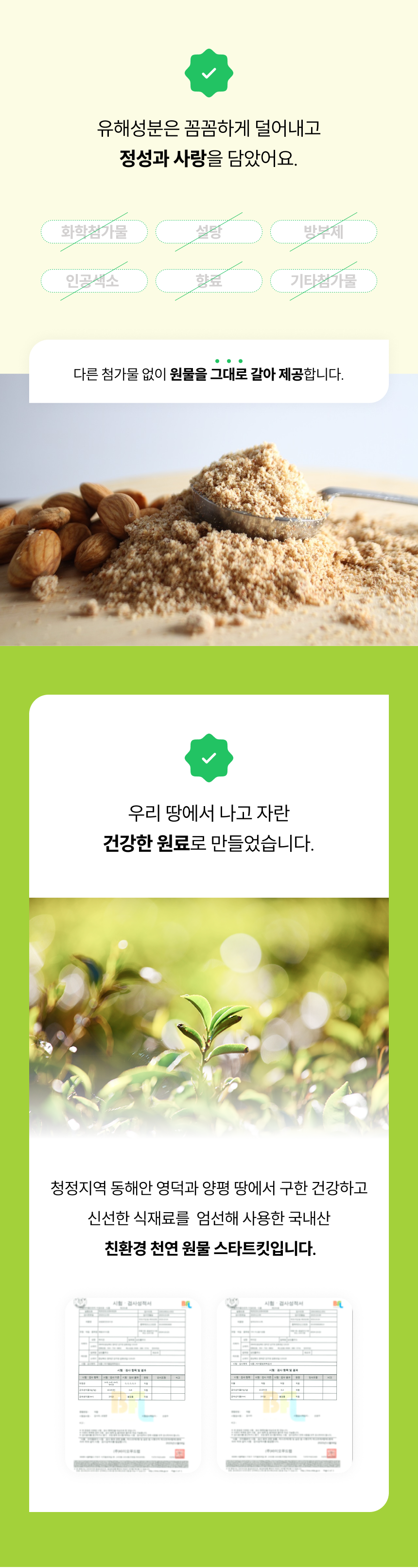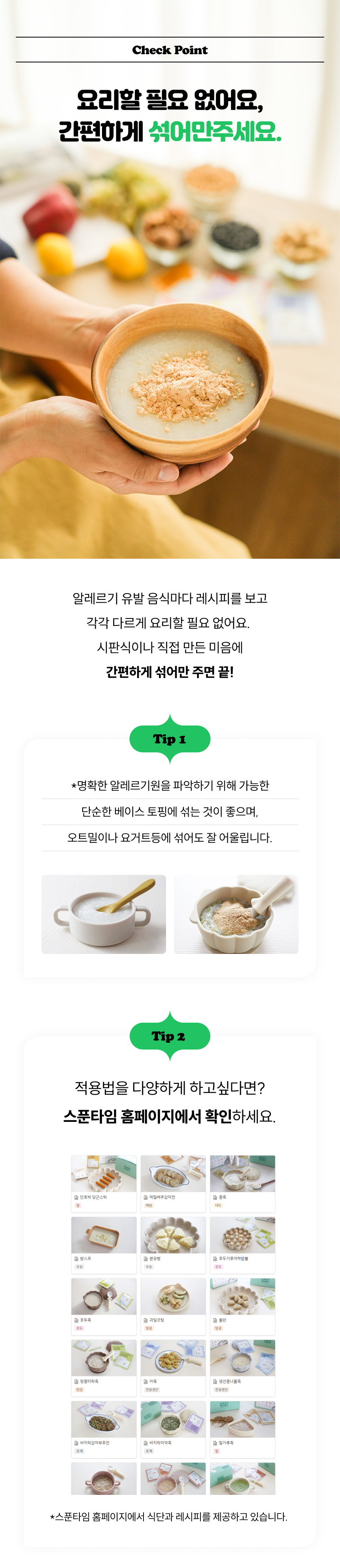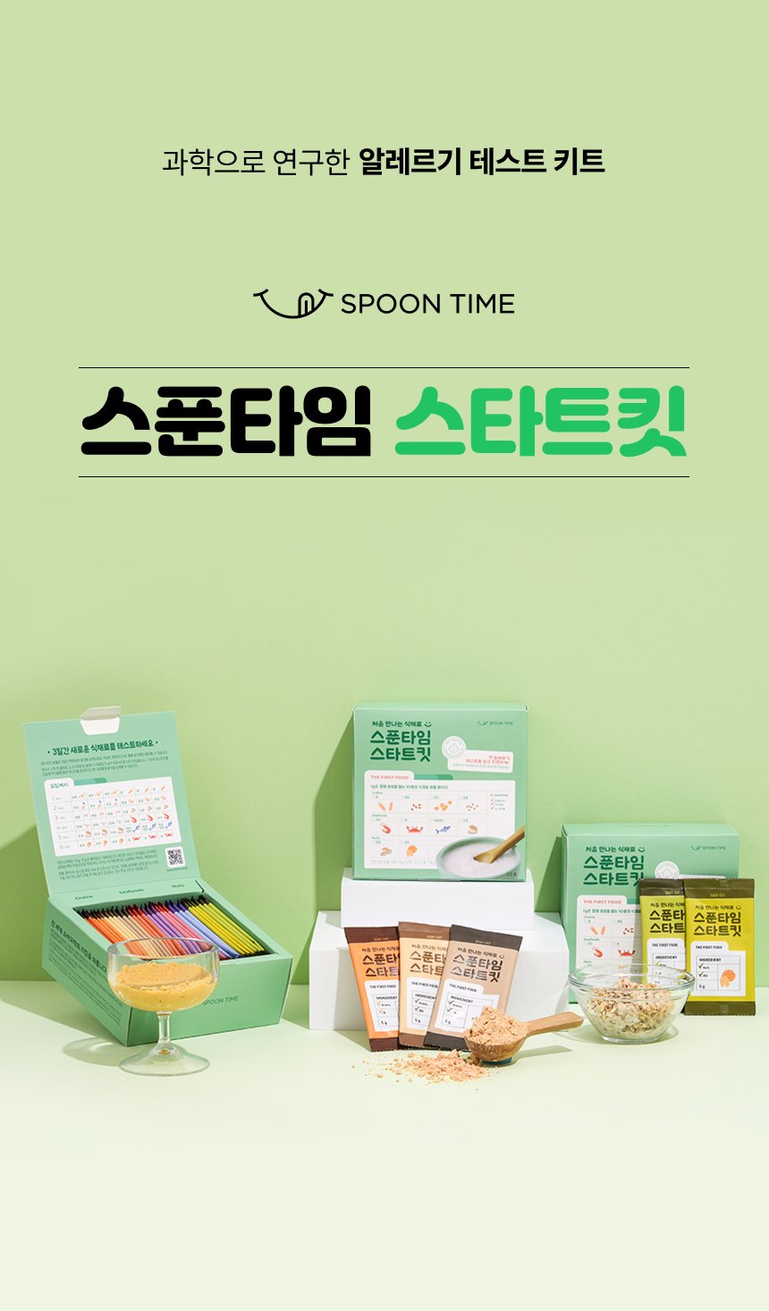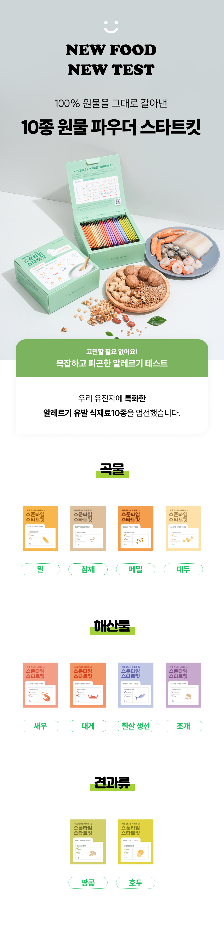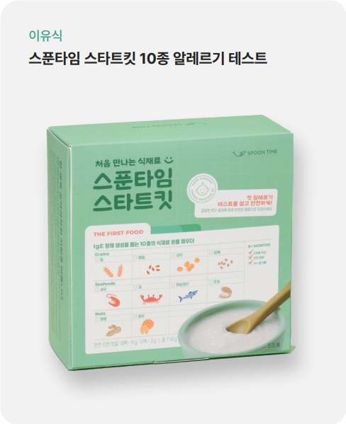 - 이유식 본격 시작 전 주요 알레르기원 (밀,땅콩,호두,대두,참깨,메밀,생선,게,조개,새우)을 3번씩 테스트할 수 있는 비조리용 가루형 제품