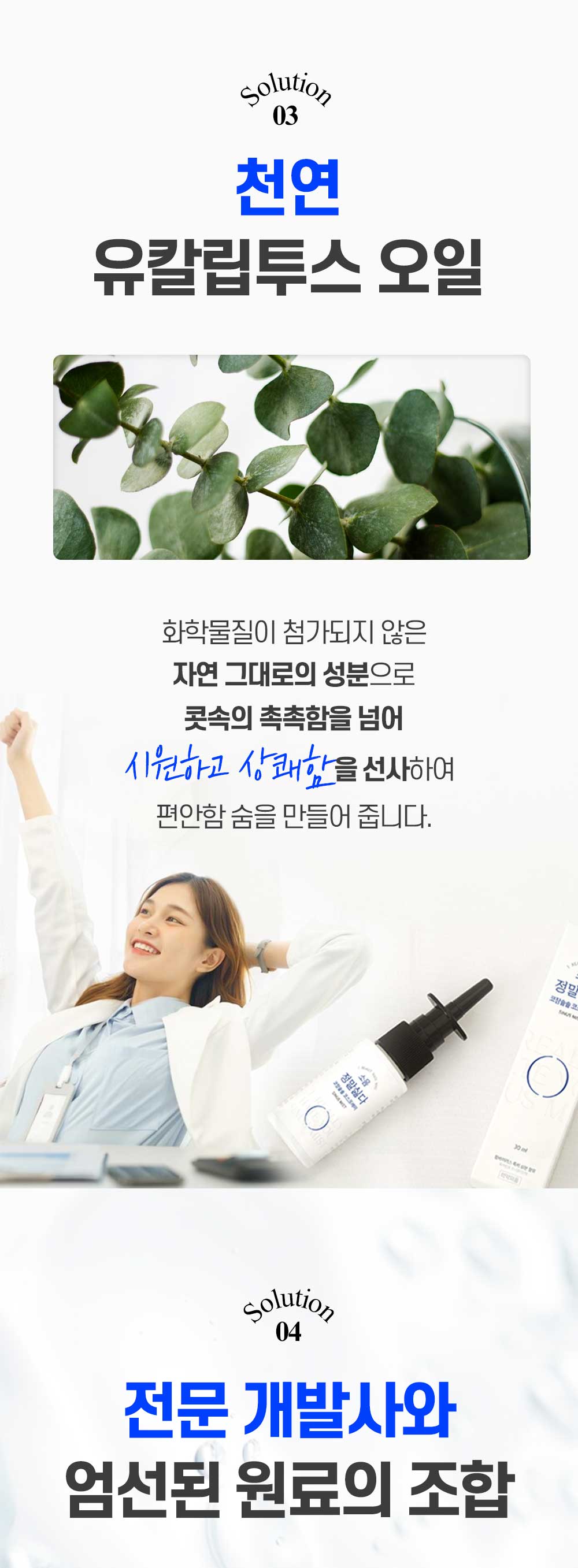 - 콧 속을 촉촉하고 상쾌하게- 폴리감마글루탐산의 뛰어난 보습력이 공기가 원활하게 유입할 수 있게 도움- 천연 유칼립투스 오일이 시원하고 상쾌함을 선사- 여러번 사용 가능