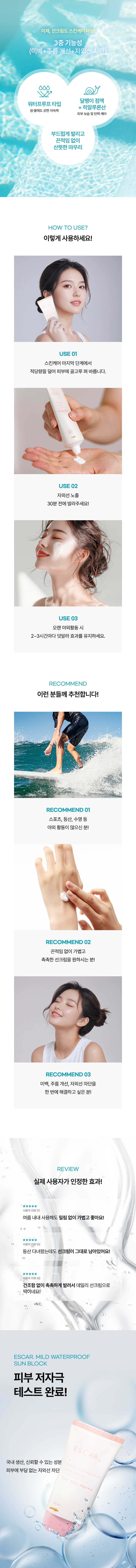 *강력한 자외선 차단 기능* 워터프루프 포뮬라* 피부 보습 및 진정 성분 함유* 가벼운 사용감과 스킨 케어 기능