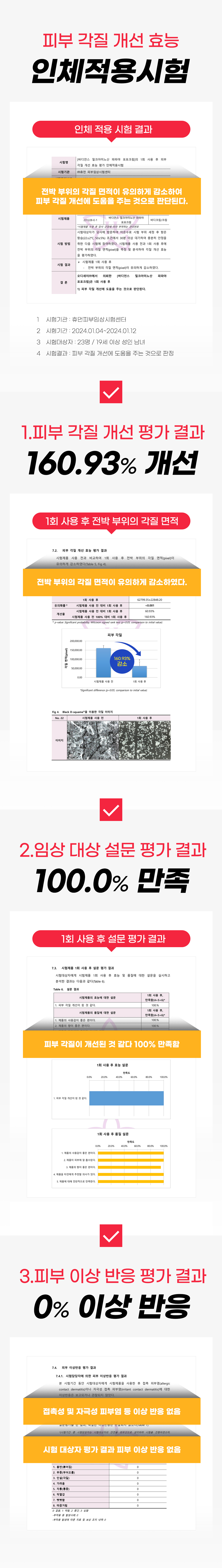 ◾피부 개선 인체적용시험, 피부 자극 테스트 완료 (각질 161% 개선 / 설문평가 100% 만족 / 0.0 무자극 판정)