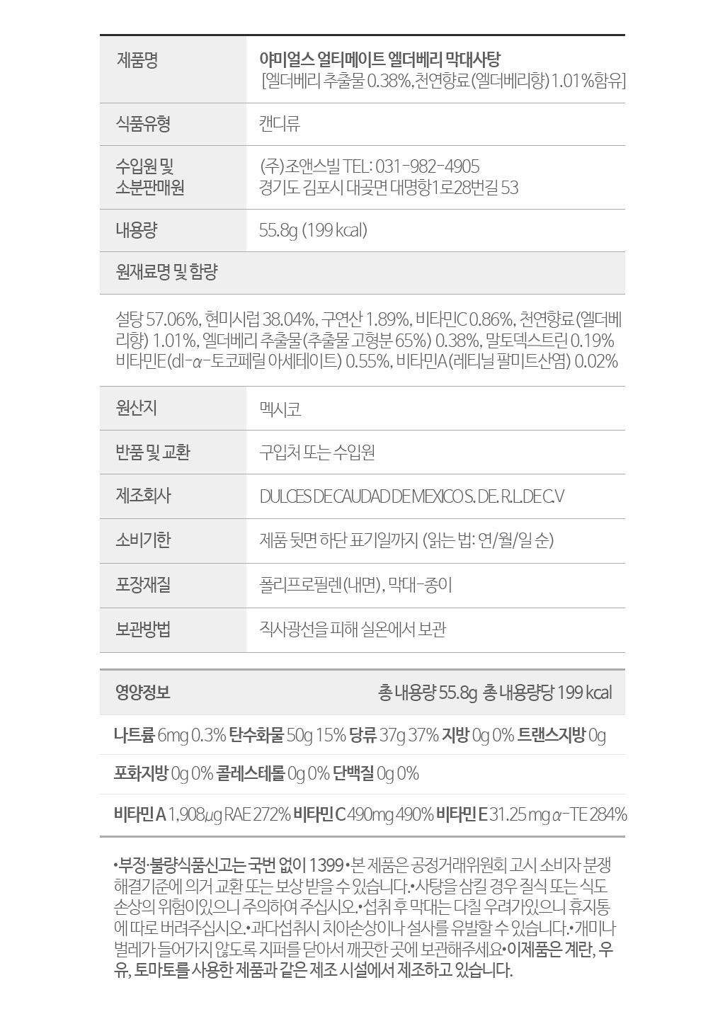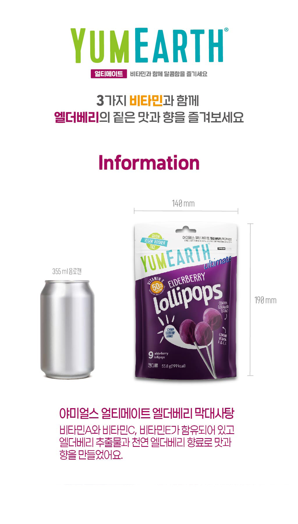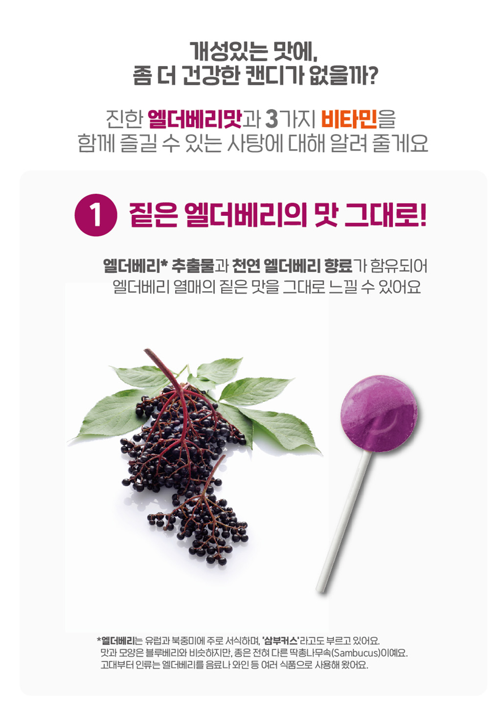 - 막대사탕 1개당 비타민A 30%, 비타민C 50%, 비타민E 30% 함유(1일 영양성분기준)- 엘더베리 추출물과 천연 엘더베리 향료 사용- 종이막대 / 비건 / 글루텐 프리 / 콩류,유제품,땅콩 제로- 화학색소 NO / 합성착향료 NO / 보존료 NO