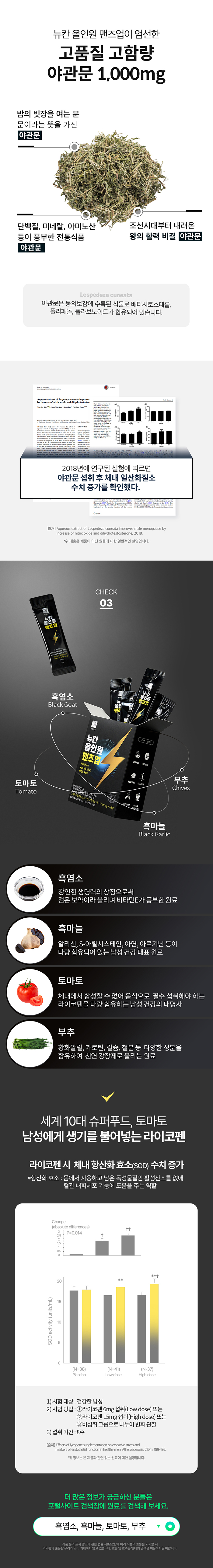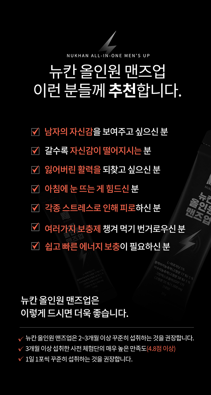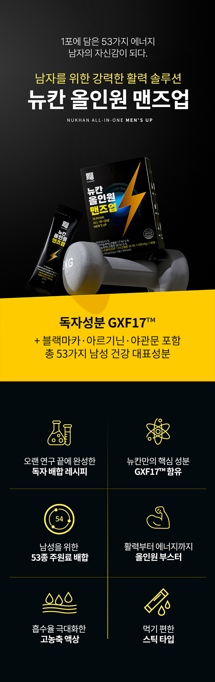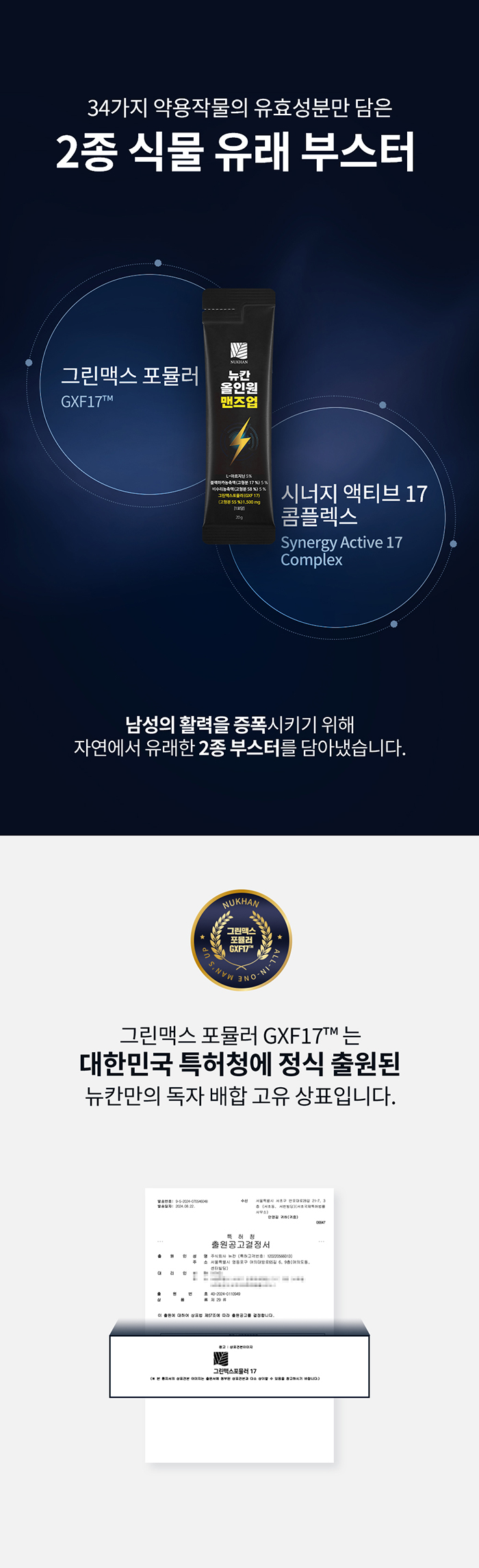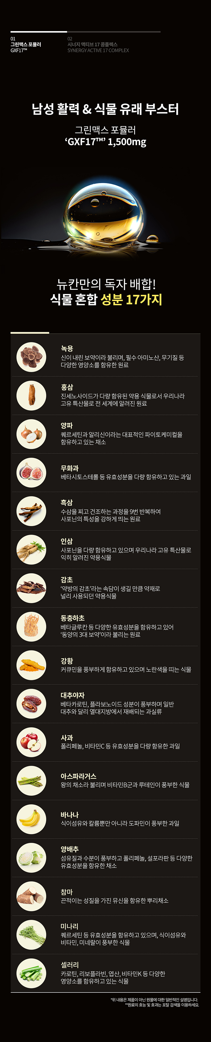■ 고품질 고함량 야관문 1,000mg 포함, 뉴칸만의 특허성분* 배합으로 남성활력, 스태미너, 에너지, 전립선 건강 한번에 관리 (*GXF17™ / 그린맥스포물러)