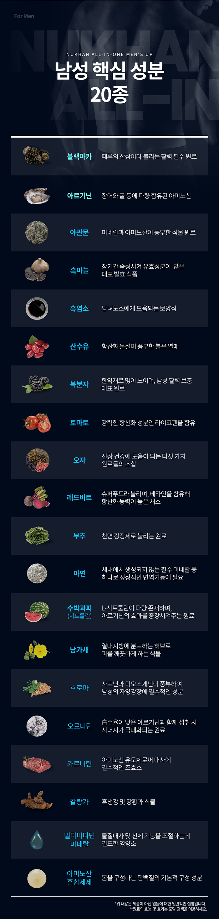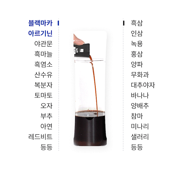 ■ 블랙마카, 아르기닌, 야관문, 복분자, 흑마늘, 흑염소, 레드비트, 녹용, 아연 등