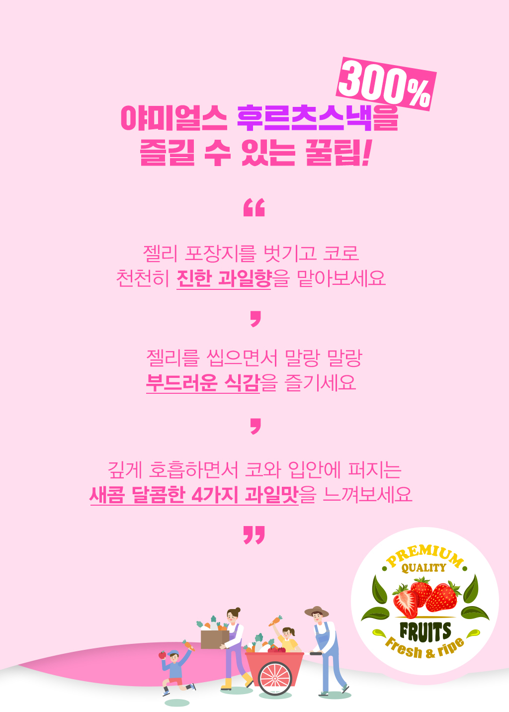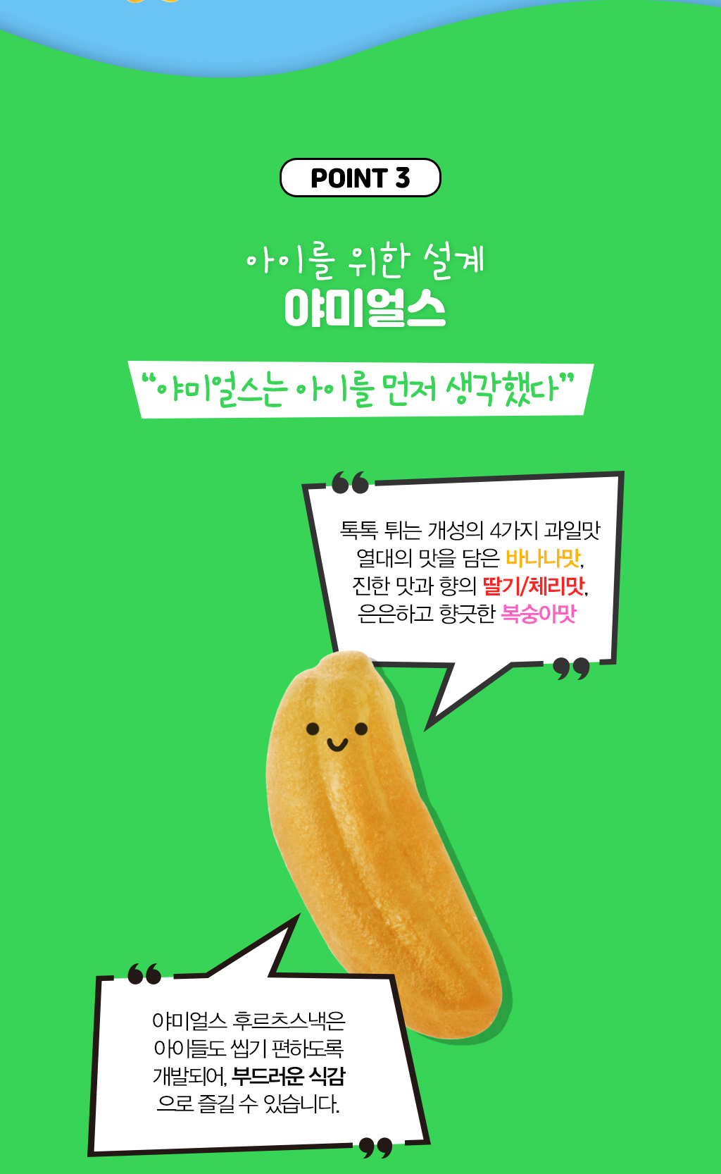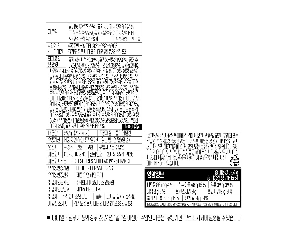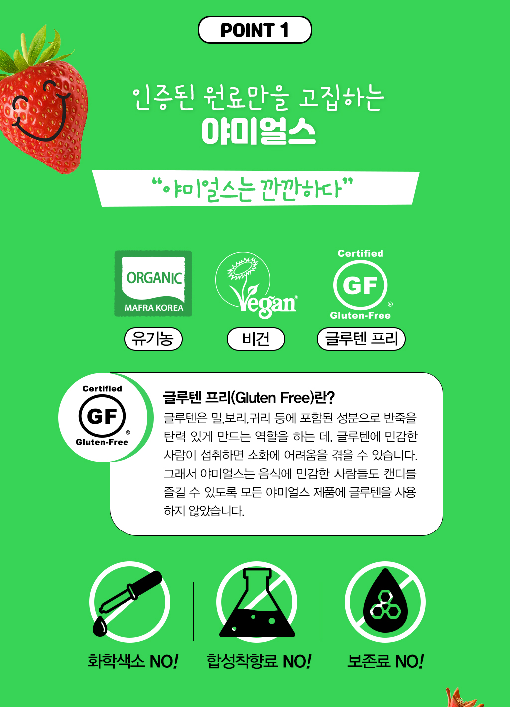 - 맛있는 유기농 간식- 4가지 과일맛(바나나맛 / 딸기,체리맛 / 복숭아맛)- 아이들도 씹기 편한 부드러운 식감- 콜레스테롤, 트랜스지방 0%- 화학색소 NO / 합성착향료 NO / 보존료 NO