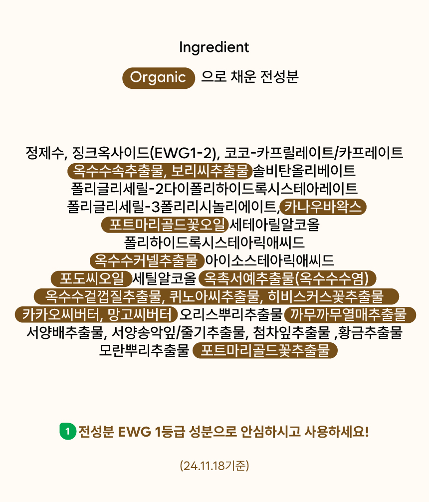 - 한국 비건 인증 & 더마테스트 무자극 인증 & 코스모스 오가닉 인증 완료