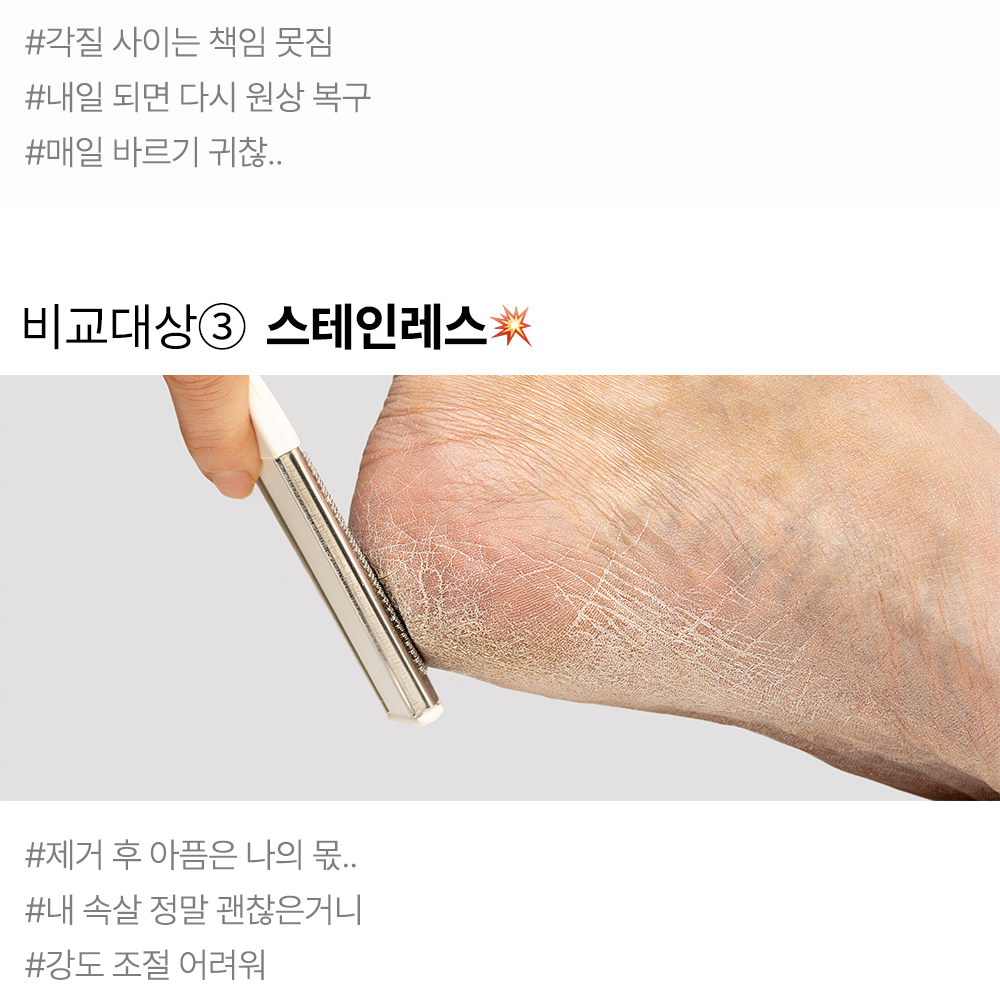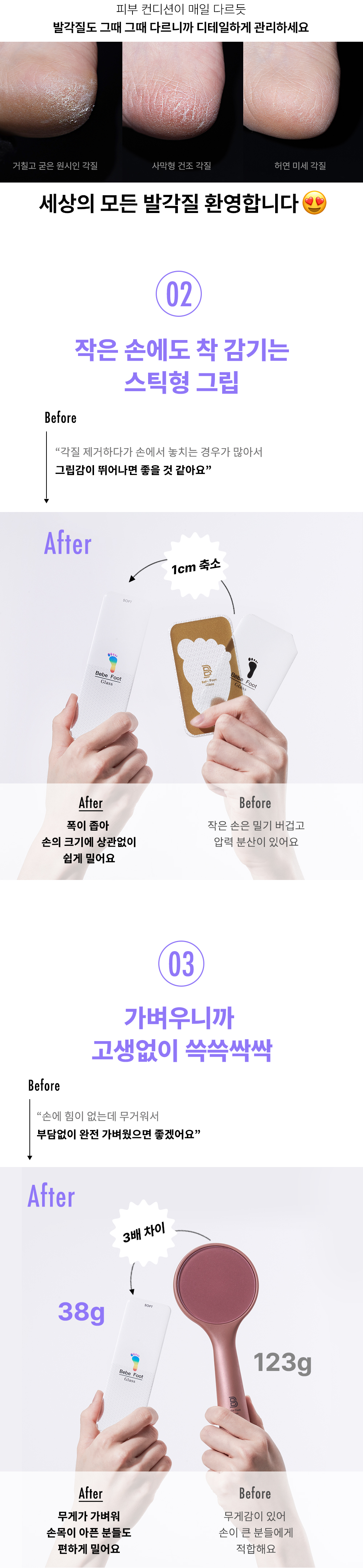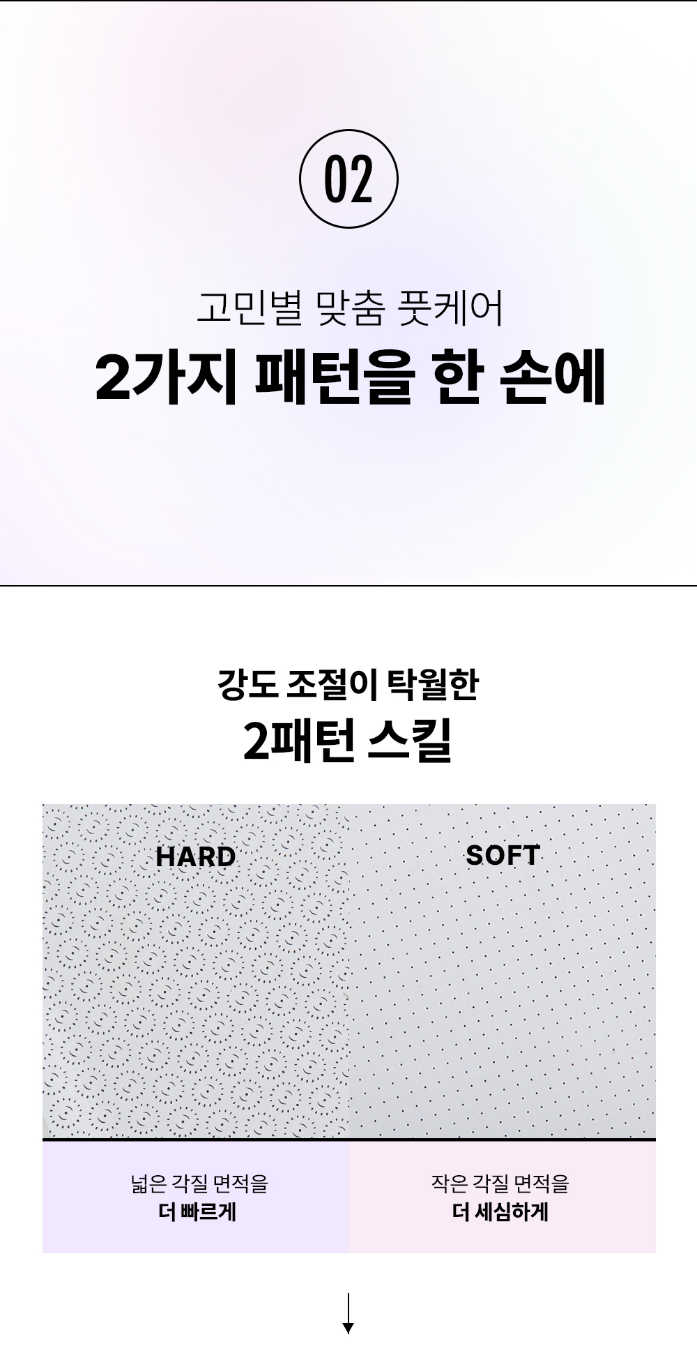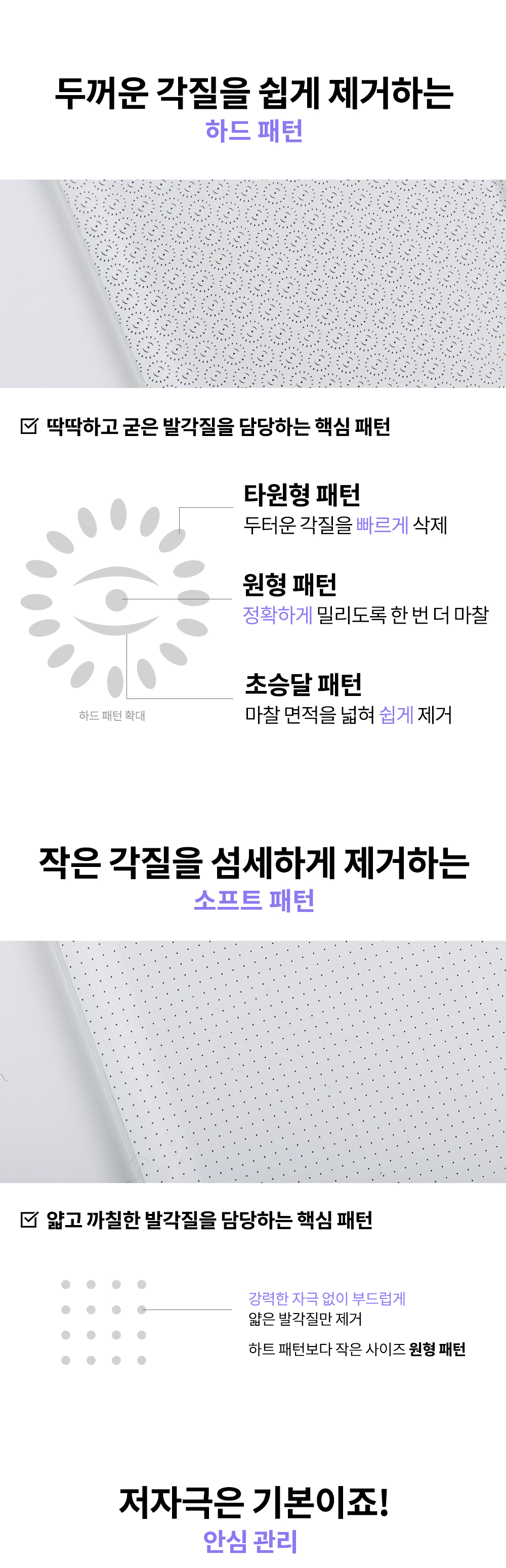 - 소프트+하드 두가지 패턴- 소프트 : 얇고 작은 각질- 하드 : 거칠고 굳은 각질- 가벼워 편한게 사용 가능