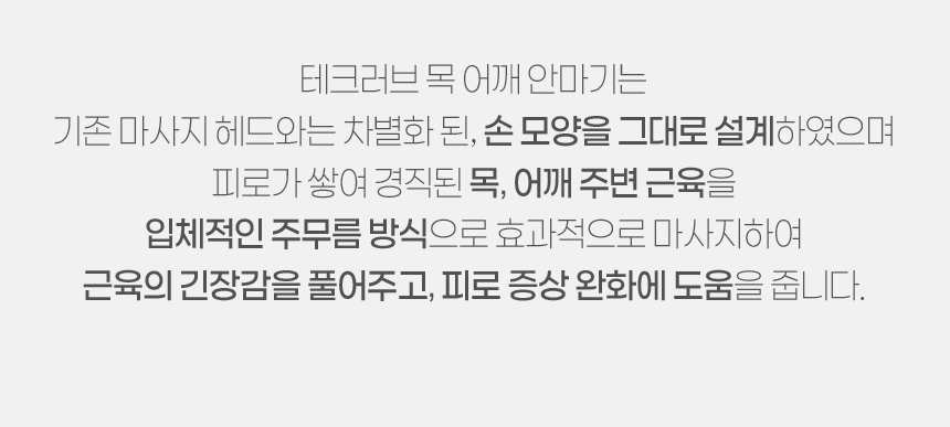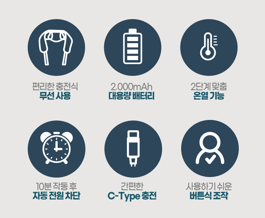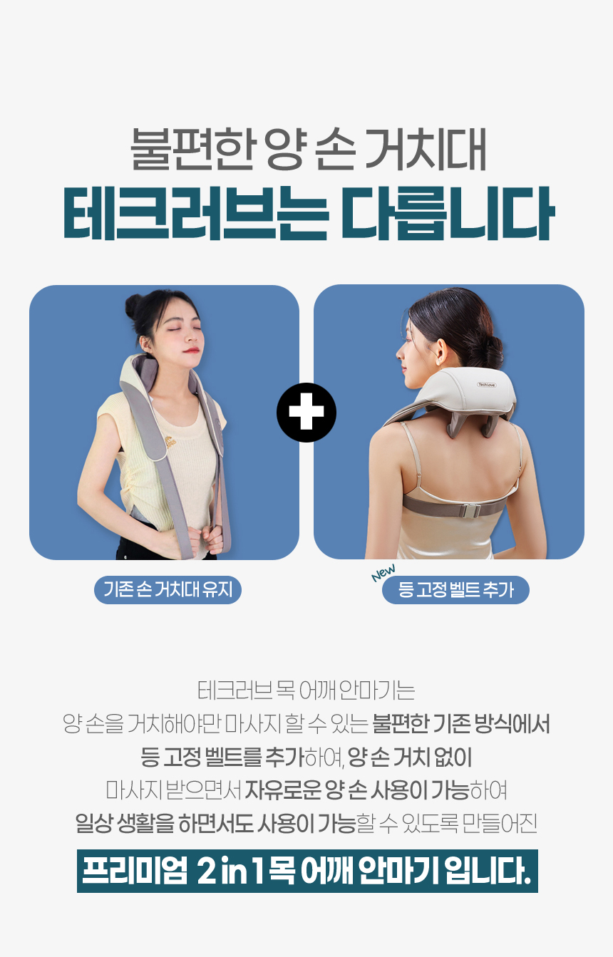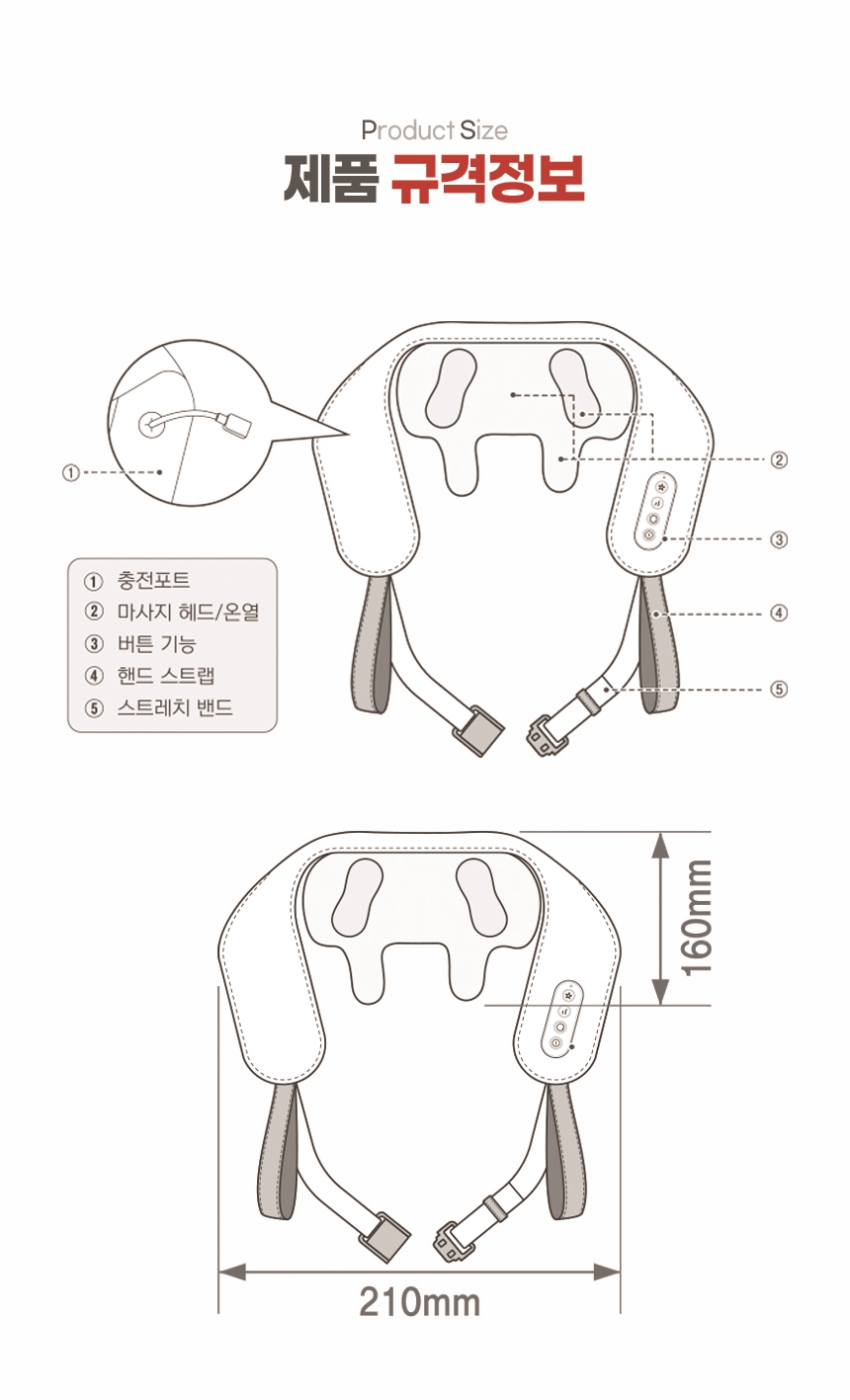 - 강력한, 3D주무름 입체마사지- 2in1 등고정벨트로 팔 거치가 필요없음- 온열찜질마사지- 무선사용, C-Type충전- 10분작동후 전원차단