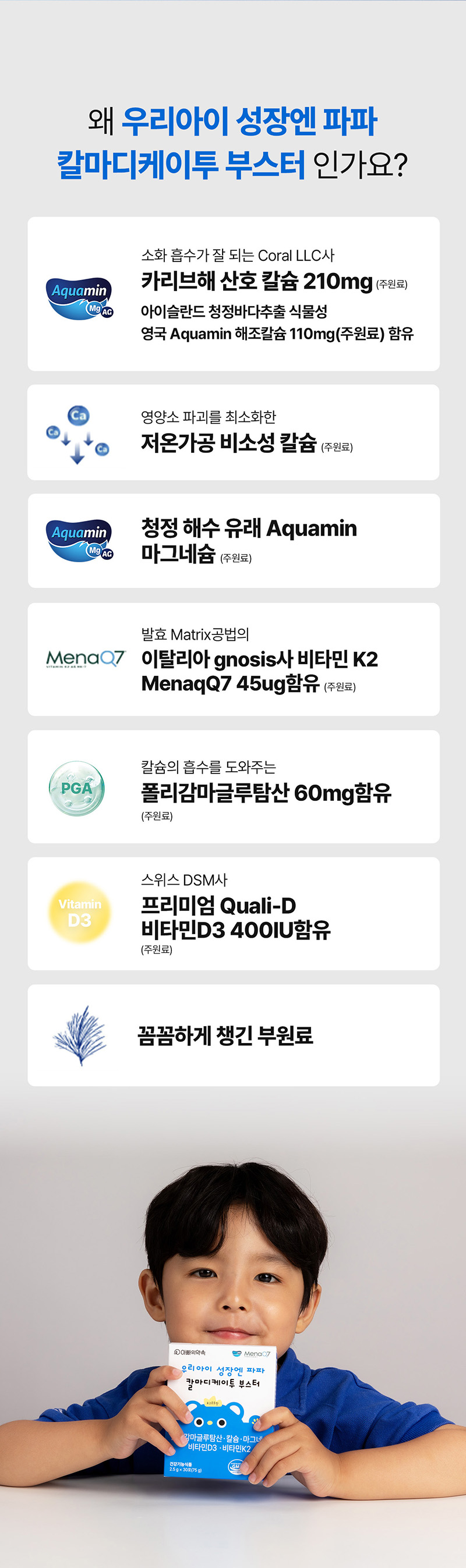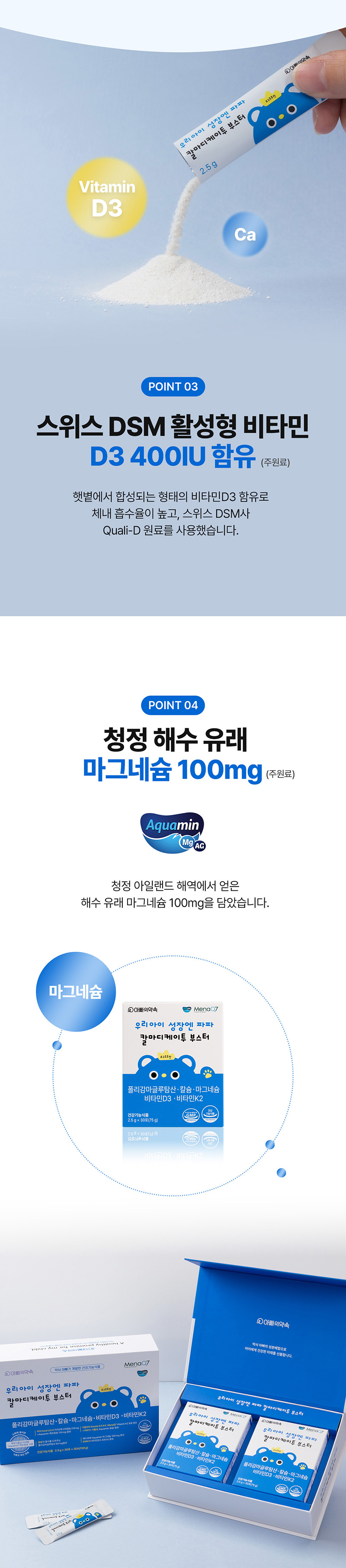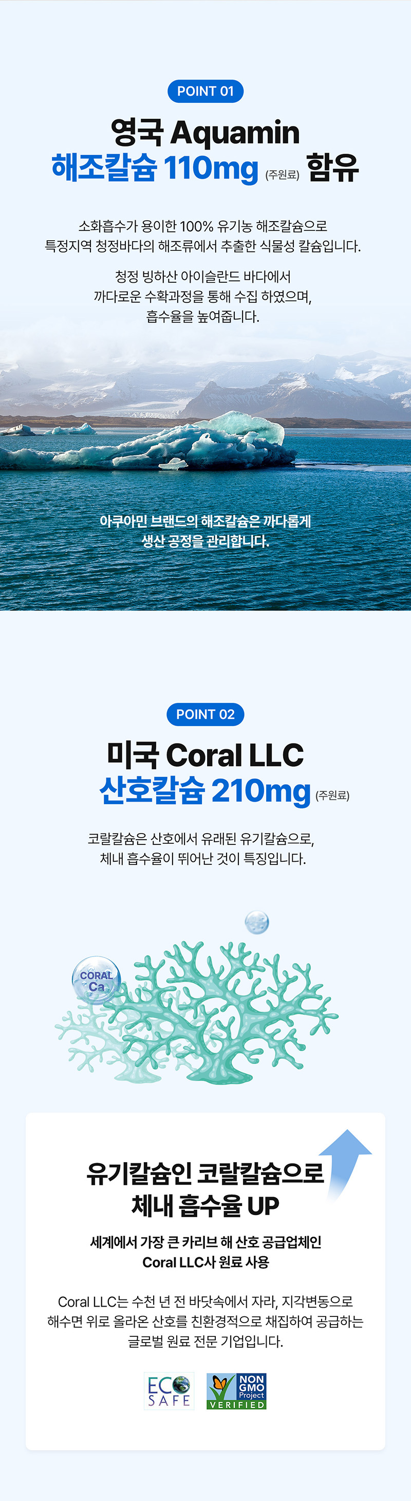 - 미국 코랄사 산호칼슘 210mg 과 아쿠아민 칼슘 110mg 총 320mg함유