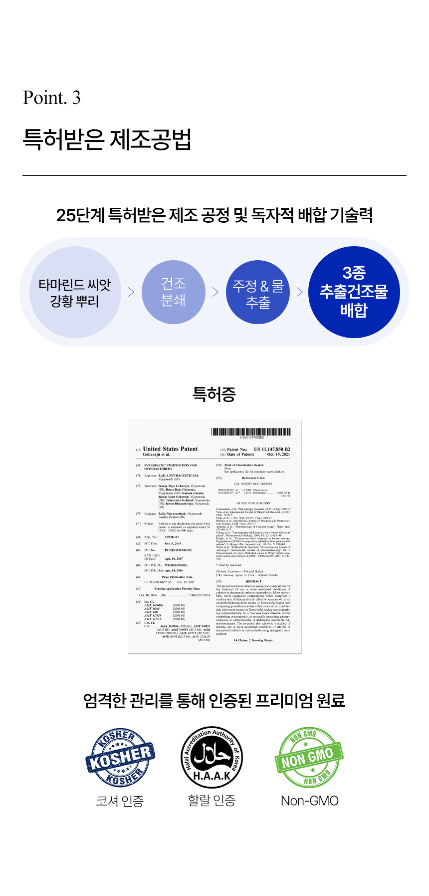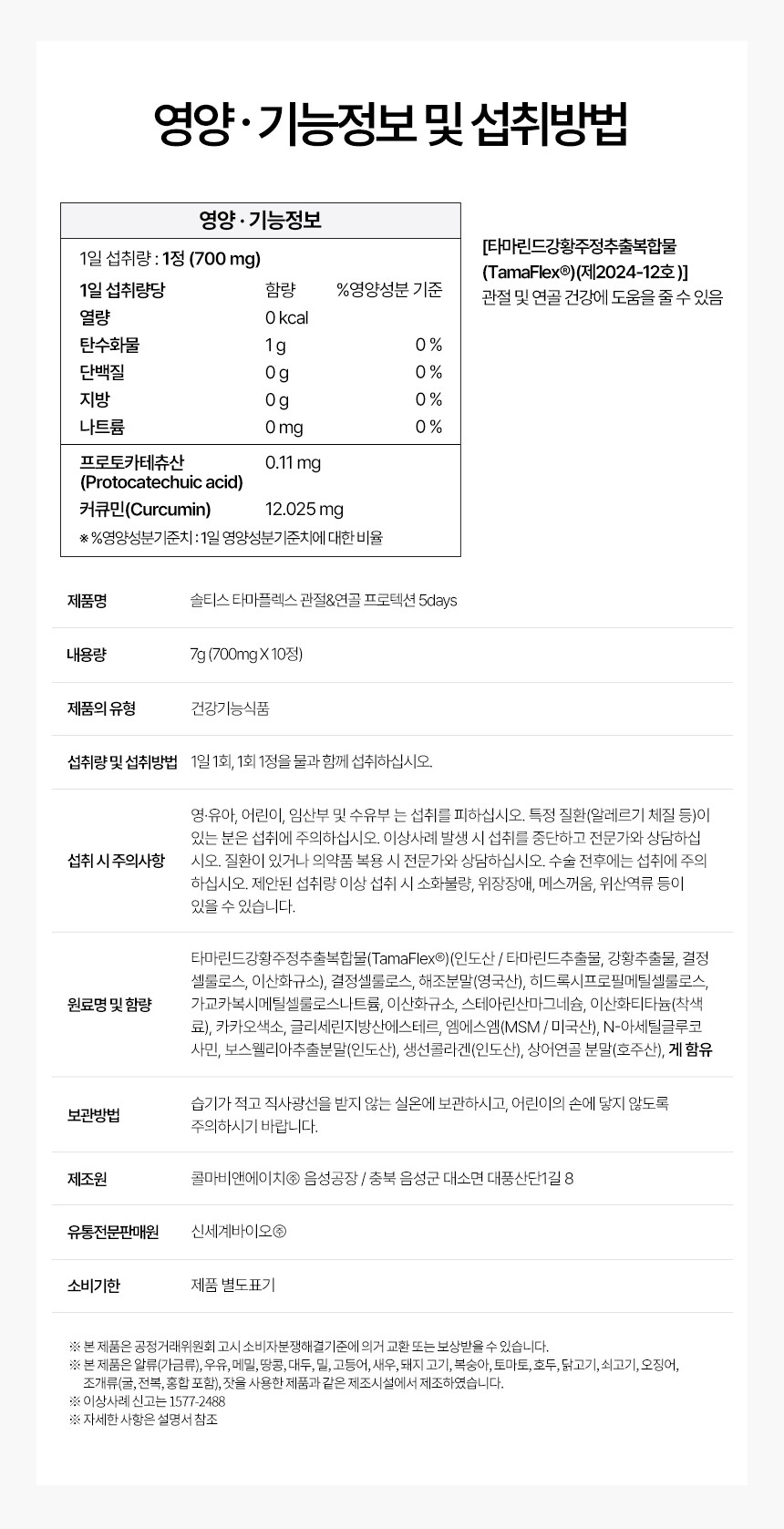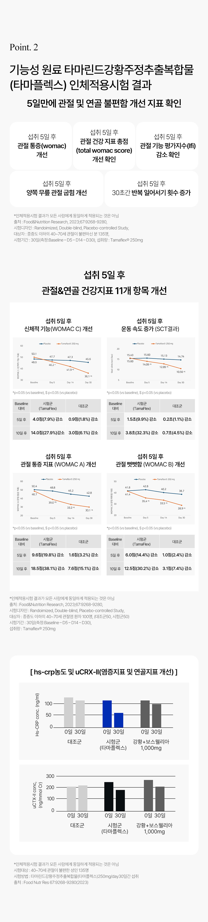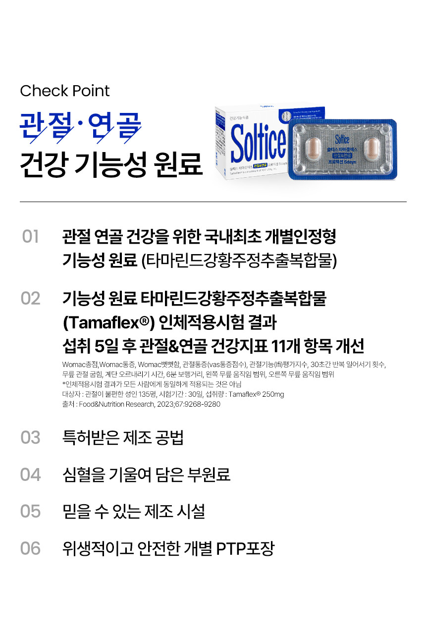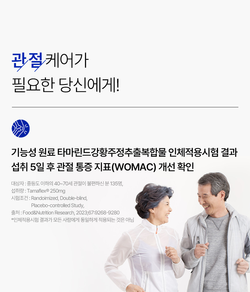 - 관절 연골 건강을 위한 국내최초 개별인정형 기능성 원료 (타마린드강황주정추출복합물)