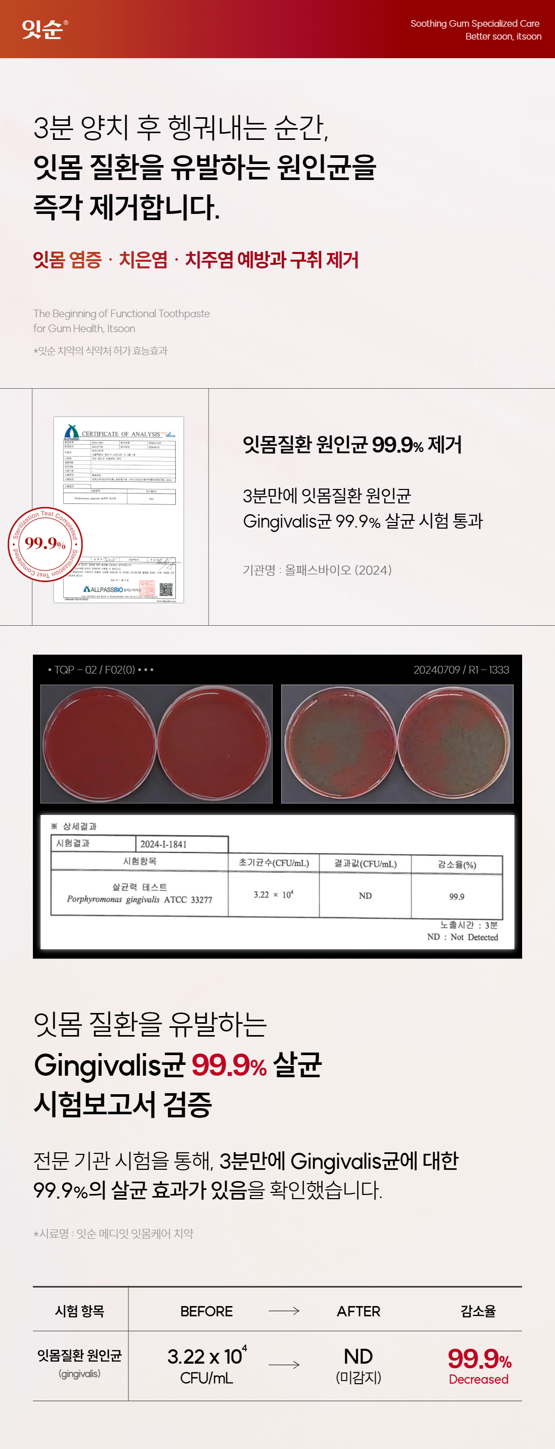 ◾잇몸질환 원인균 99.9% 제거 시험기관 확인