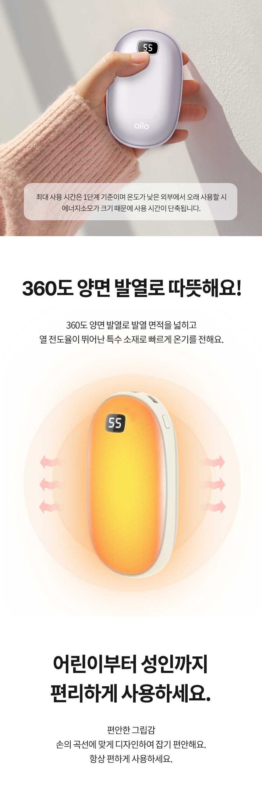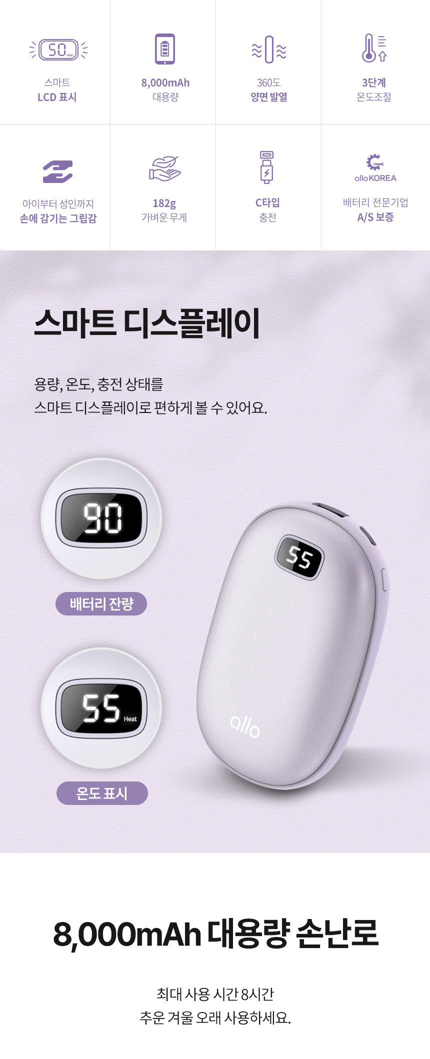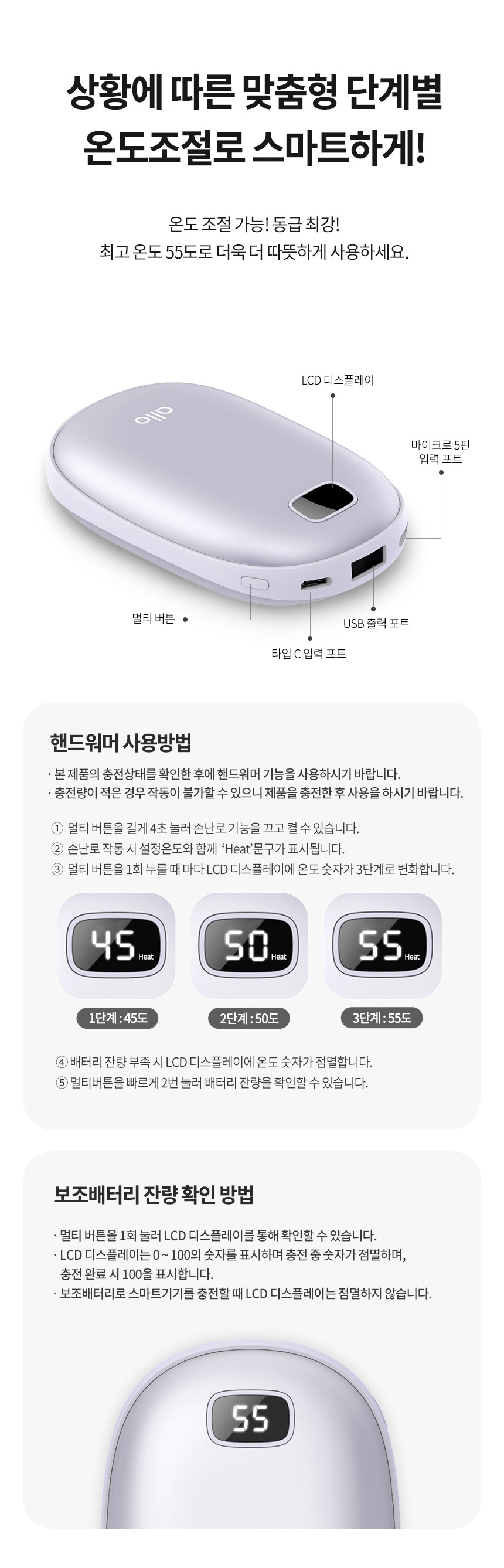 - 손난로+보조배터리 8,000mAh- 양면발열, 3단계 온도조절(45도, 50도, 55도)- C type충전