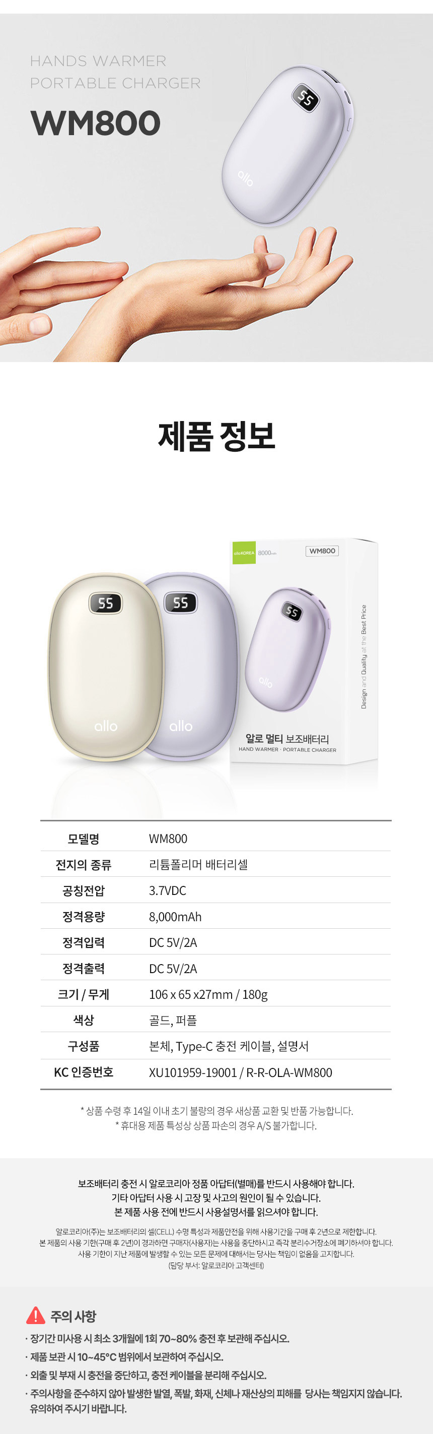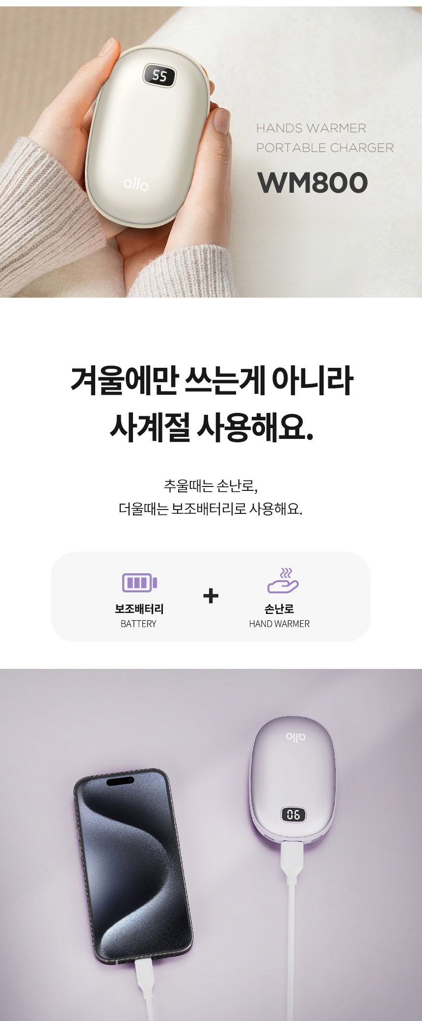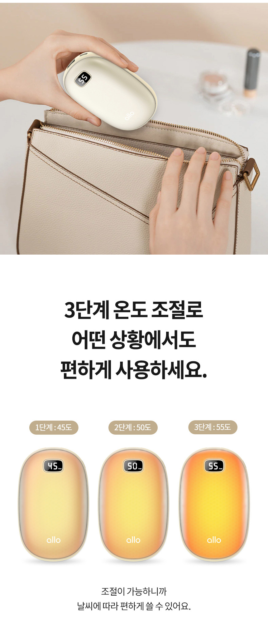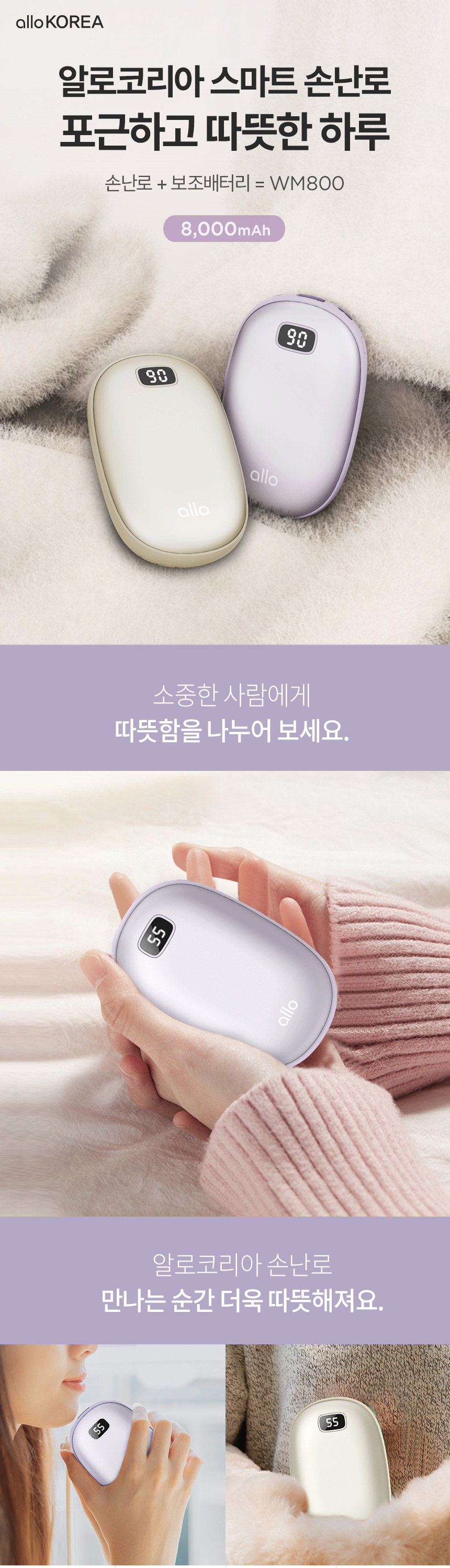 - 손난로+보조배터리 8,000mAh- 양면발열, 3단계 온도조절(45도, 50도, 55도)- C type충전
